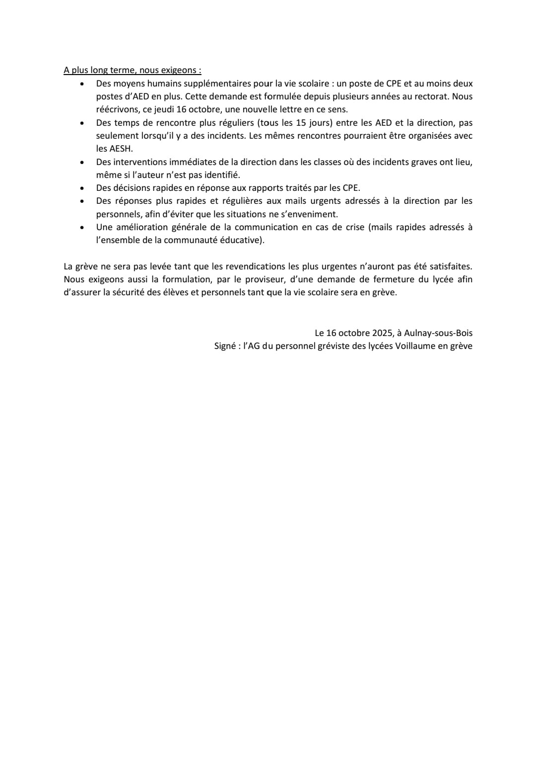 Vous êtes ici : Accueil actu des établissements Seine-Saint-Denis Communiqué de l’AG du personnel gréviste du Lycée Voillaume (Aulnay sous Bois) 16 octobre 2025 actu des établissements Communiqué de l’AG du personnel gréviste du Lycée Voillaume (Aulnay sous Bois)