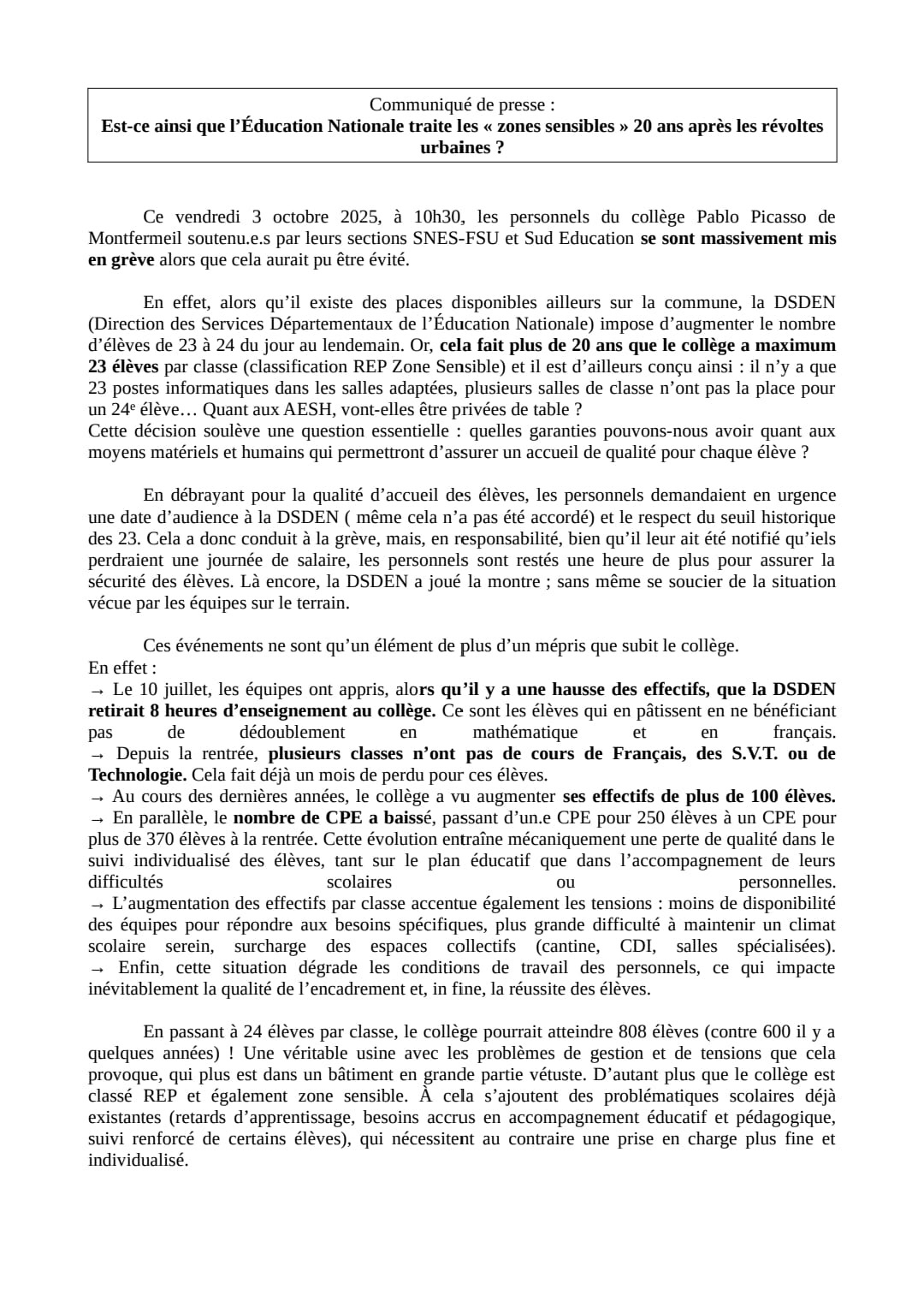 Vous êtes ici : Accueil actu des établissements Seine-Saint-Denis Communiqué de presse des personnels du collège Pablo Picasso (Montfermeil) 5 octobre 2025 actu des établissements Communiqué de presse des personnels du collège Pablo Picasso (Montfermeil) Communiqué de presse des personnels du 3 octobre 2025.