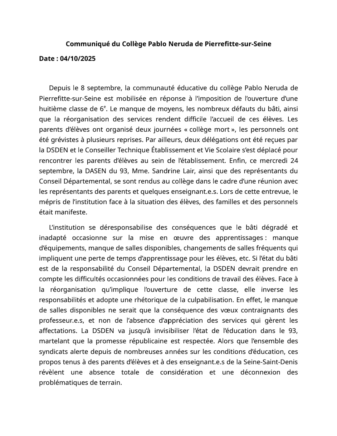 Vous êtes ici : Accueil actu des établissements Seine-Saint-Denis Communiqué des personnels du collège Pablo Neruda (Pierrefitte) : stop au mépris ! 4 octobre 2025 actu des établissements Communiqué des personnels du collège Pablo Neruda (Pierrefitte) : stop au mépris ! Communiqué des personnels du 4 octobre 2025.