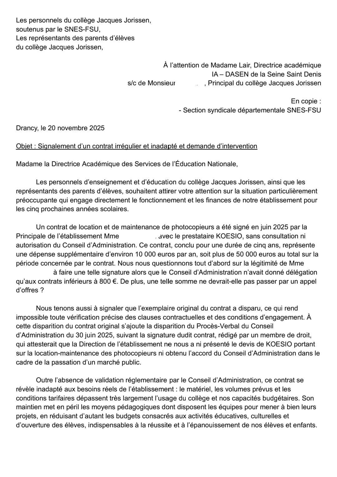 Vous êtes ici : Accueil actu des établissements Seine-Saint-Denis Étrange convention signée par l’ancienne ordonnatrice du collège Jorissen (Drancy) 23 novembre 2025 actu des établissements Étrange convention signée par l’ancienne ordonnatrice du collège Jorissen (Drancy)