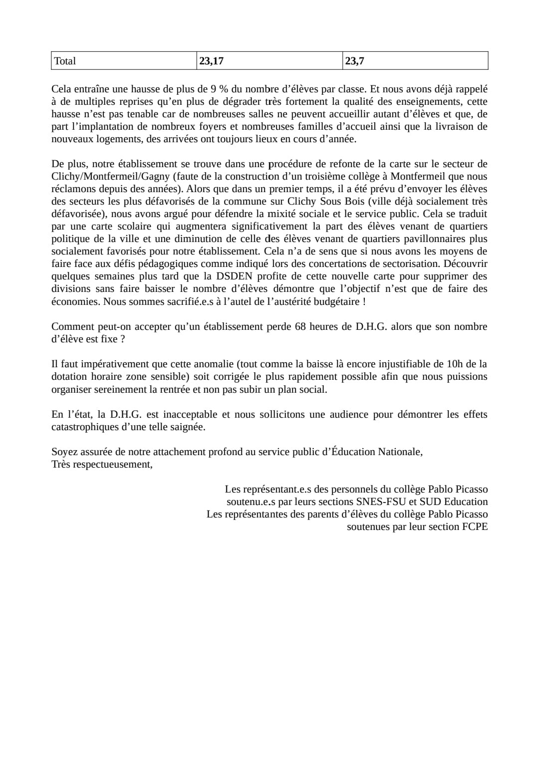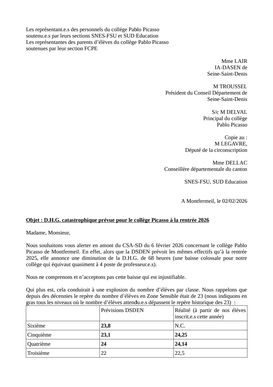Vous êtes ici : Accueil actu des établissements Seine-Saint-Denis Face à une DHG inacceptable, le collège Picasso (Montfermeil) en lutte 2 février 2026 actu des établissements Face à une DHG inacceptable, le collège Picasso (Montfermeil) en lutte