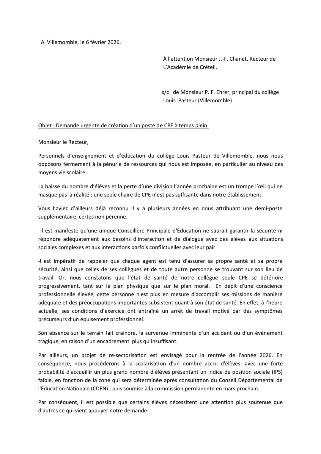 Vous êtes ici : Accueil actu des établissements Seine-Saint-Denis Il faut un 2 ème CPE au collège Louis Pasteur (Villemomble) 8 février 2026 actu des établissements Il faut un 2 ème CPE au collège Louis Pasteur (Villemomble)