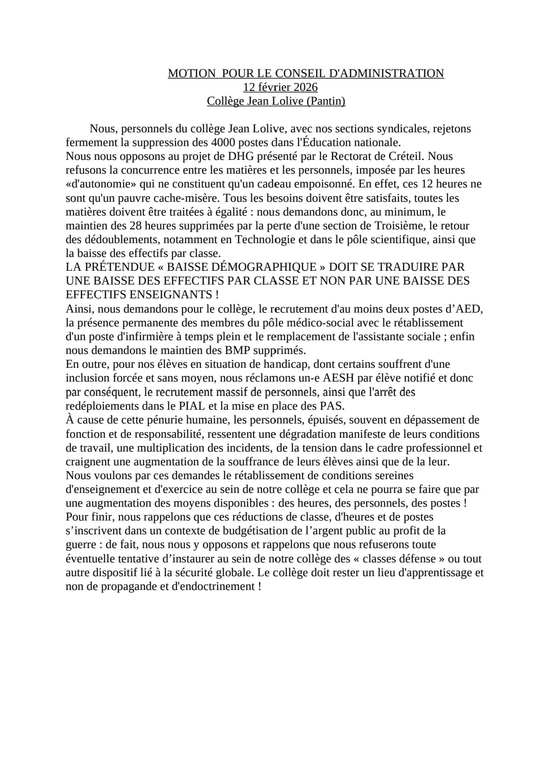 Vous êtes ici : Accueil actu des établissements Seine-Saint-Denis Il faut un plan d’urgence pour le collège Jean Lolive (Pantin) 12 février 2026 actu des établissements Il faut un plan d’urgence pour le collège Jean Lolive (Pantin) Motion votée en conseil d’administration le 12 février 2026.