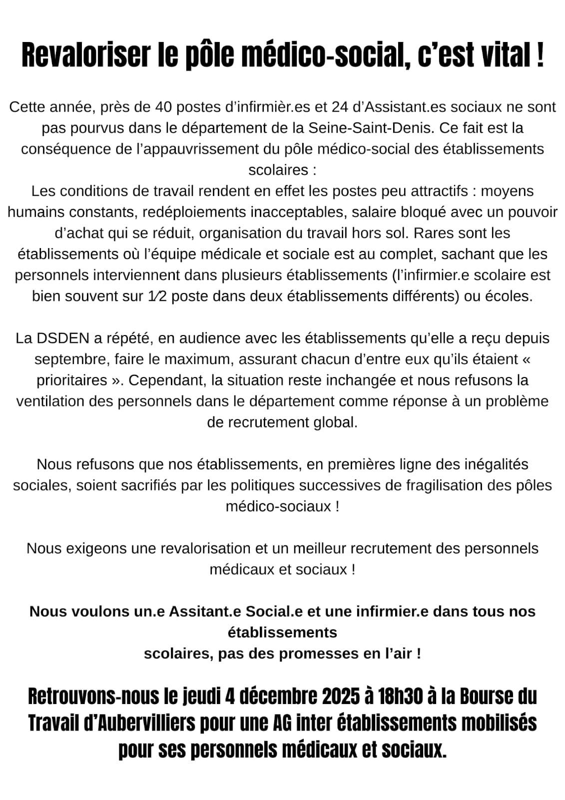 Vous êtes ici : Accueil actu des établissements Seine-Saint-Denis La mobilisation se poursuit pour la défense des pôles médico-sociaux . Rdv le 2 décembre puis le 4 décembre en AG 28 novembre 2025 actu des établissements La mobilisation se poursuit pour la défense des pôles médico-sociaux . Rdv le 2 décembre puis le 4 décembre en AG