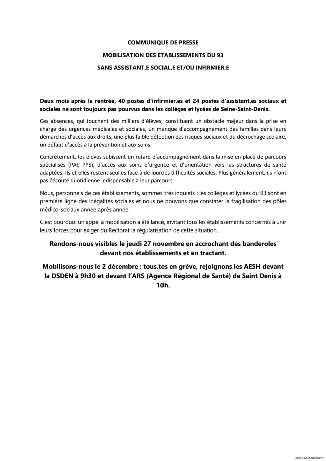 Vous êtes ici : Accueil actu des établissements Seine-Saint-Denis La mobilisation se poursuit pour les pôles médico-sociaux. 23 novembre 2025 actu des établissements La mobilisation se poursuit pour les pôles médico-sociaux. Communiqué de presse des personnels des pôles médico-sociaux du 93.