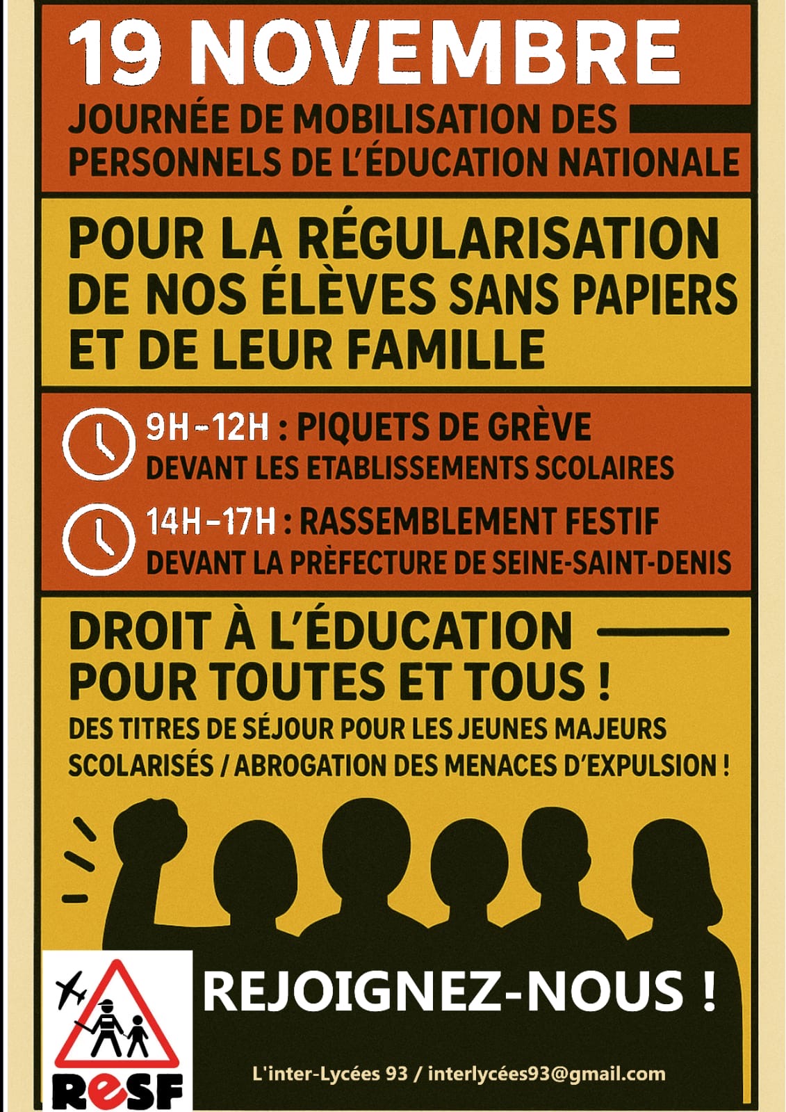 Vous êtes ici : Accueil actu des établissements Seine-Saint-Denis Le 19 novembre avec RESF, on se mobilise pour la régularisation de nos élèves sans papiers et de leur famille 10 novembre 2025 actu des établissements Le 19 novembre avec RESF, on se mobilise pour la régularisation de nos élèves sans papiers et de leur famille Action en coordination avec RESF 93.