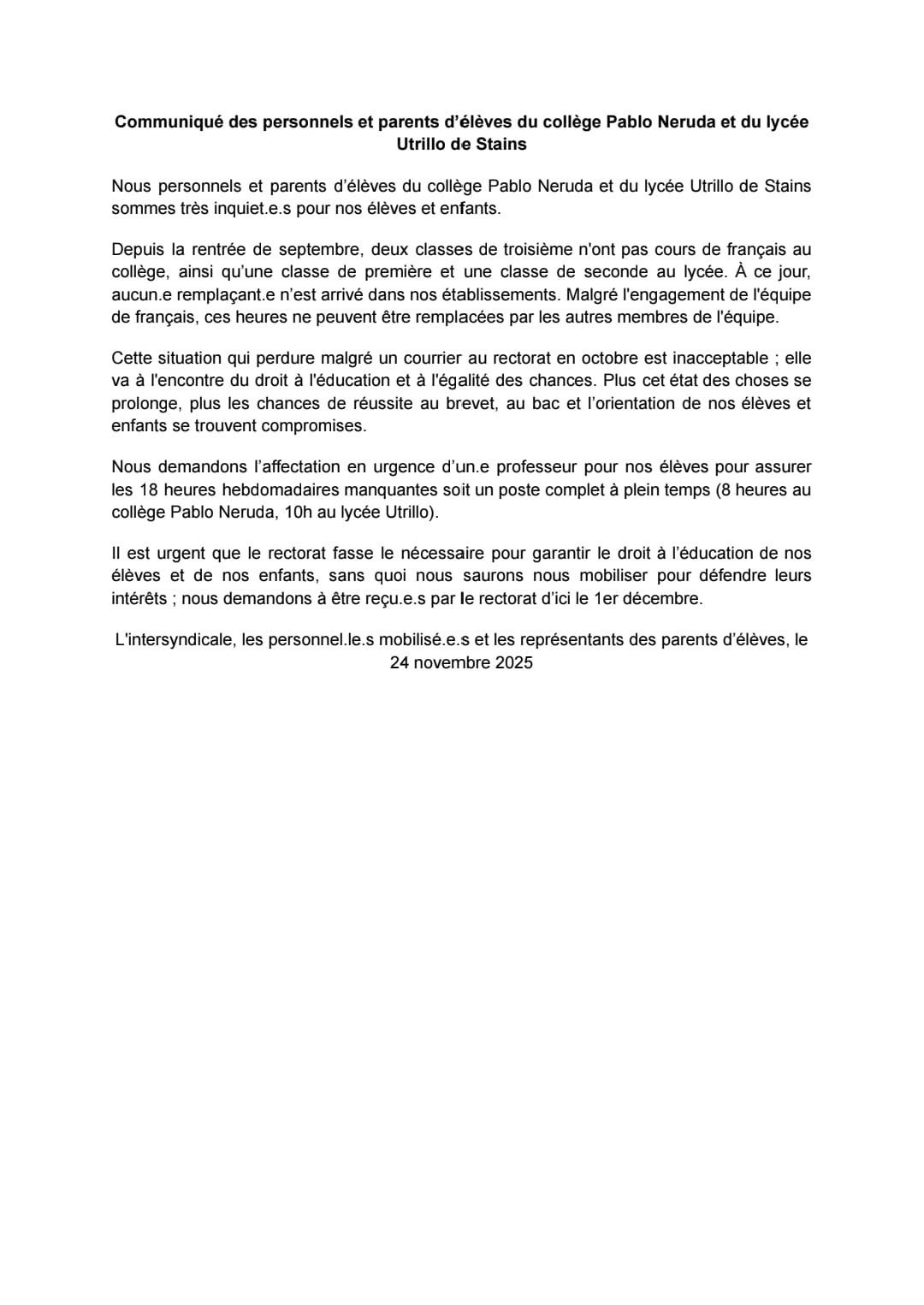 Vous êtes ici : Accueil actu des établissements Seine-Saint-Denis Le collège Neruda et le lycée Utrillo se mobilisent pour le service public d’éducation 27 novembre 2025 actu des établissements Le collège Neruda et le lycée Utrillo se mobilisent pour le service public d’éducation Pétition :https://secure-web.cisco.com/1u_iZc0DJcsW4FxOOpqOeNSAf12f7-110h4WXpguuljVK5IFptRzLJ9G4ZCQnTTlvbeQ5mG2yto8Z8LKrhj582LNILaOP_3Xz8F7BR6nN2A-pZsVNfizBMxHideFo-brYTqgqzv3uKvbA2lW_q9nkiJi495FYEKTHpspgRm7Txcp-qGgNUzkmYre02Ze0_y5nNPEF10j7Djz8jTpLp5MFdnp8DeRByJxsVL0jW-vkj_72cz7Yx3KK9wn6aBniGHuYFglVInGj2-Kr6KM4r2yloGc0RVQ6lhdFvM-RwkmzT_T82SV1DbOnywHz7d3KArJoPO8-X7we7CiXGbBGKtbRwJHKxl-MIe-3TxnfFRzT55jSMHS2-cIBFOQjPYZy0qO4w4Ztq_4NUr8sTK_qg5-N7Qy7hXkmSaXXQrWerqAQnLOiRqRndWPtpQgN9ye_iwogq43bNvO1be4tfk-PD3k6IoLn6McTIYQtvzbbCiBTlPoyzTx9SFle9TbPzLLxIPT_/https%3A%2F%2Fc.org%2FtsG6fGyCrF