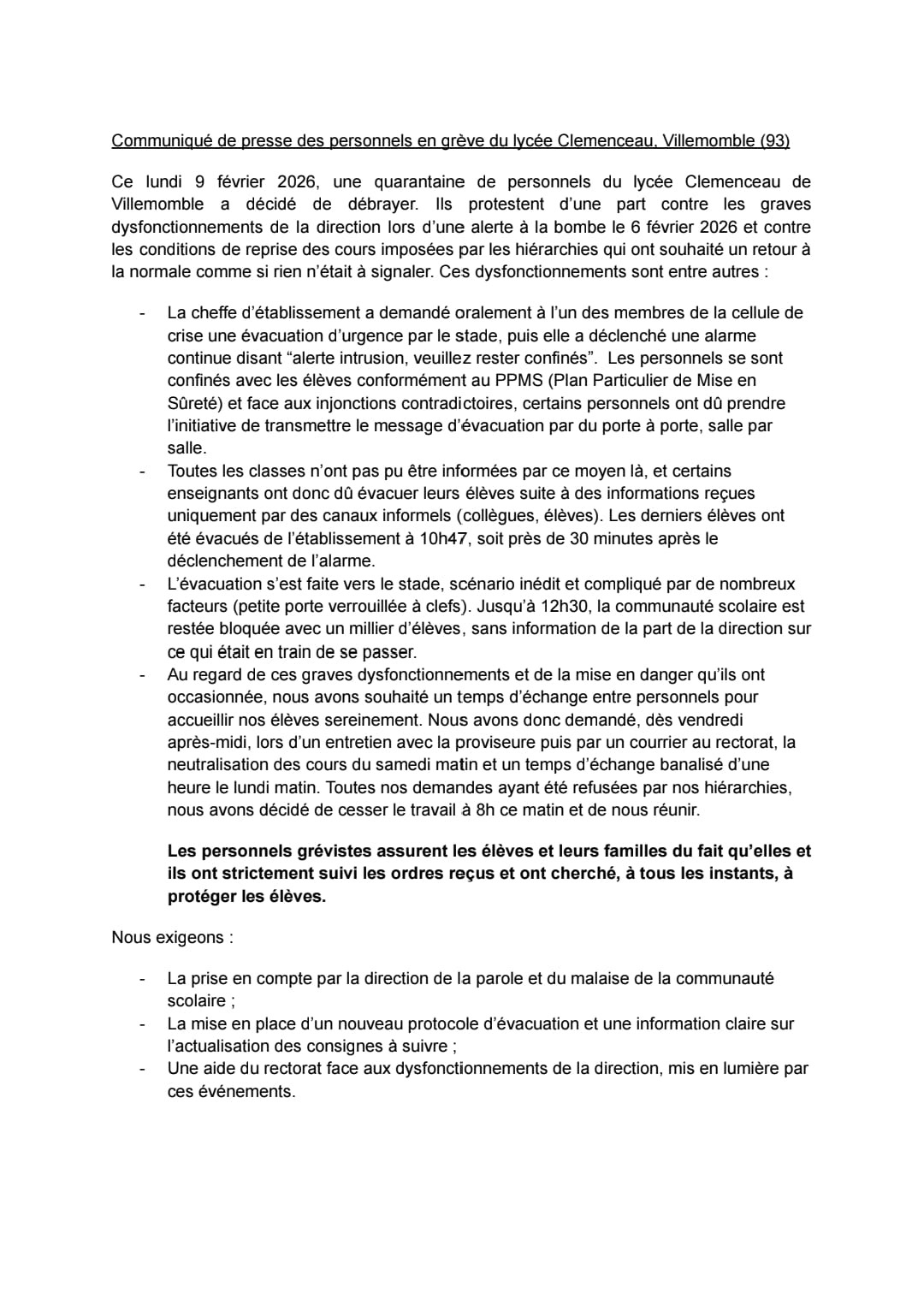 Vous êtes ici : Accueil actu des établissements Seine-Saint-Denis Le lycée Clémenceau (Villemomble) toujours en crise 9 février 2026 actu des établissements Le lycée Clémenceau (Villemomble) toujours en crise
