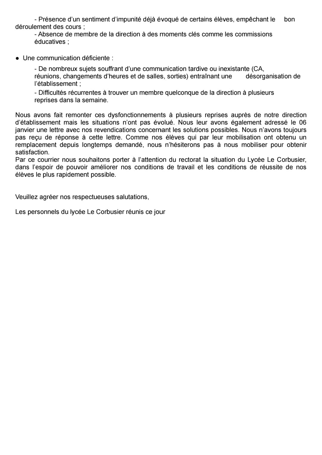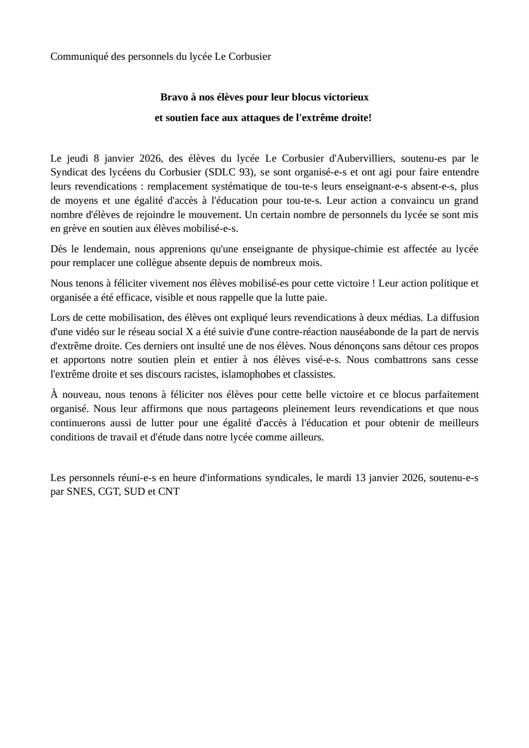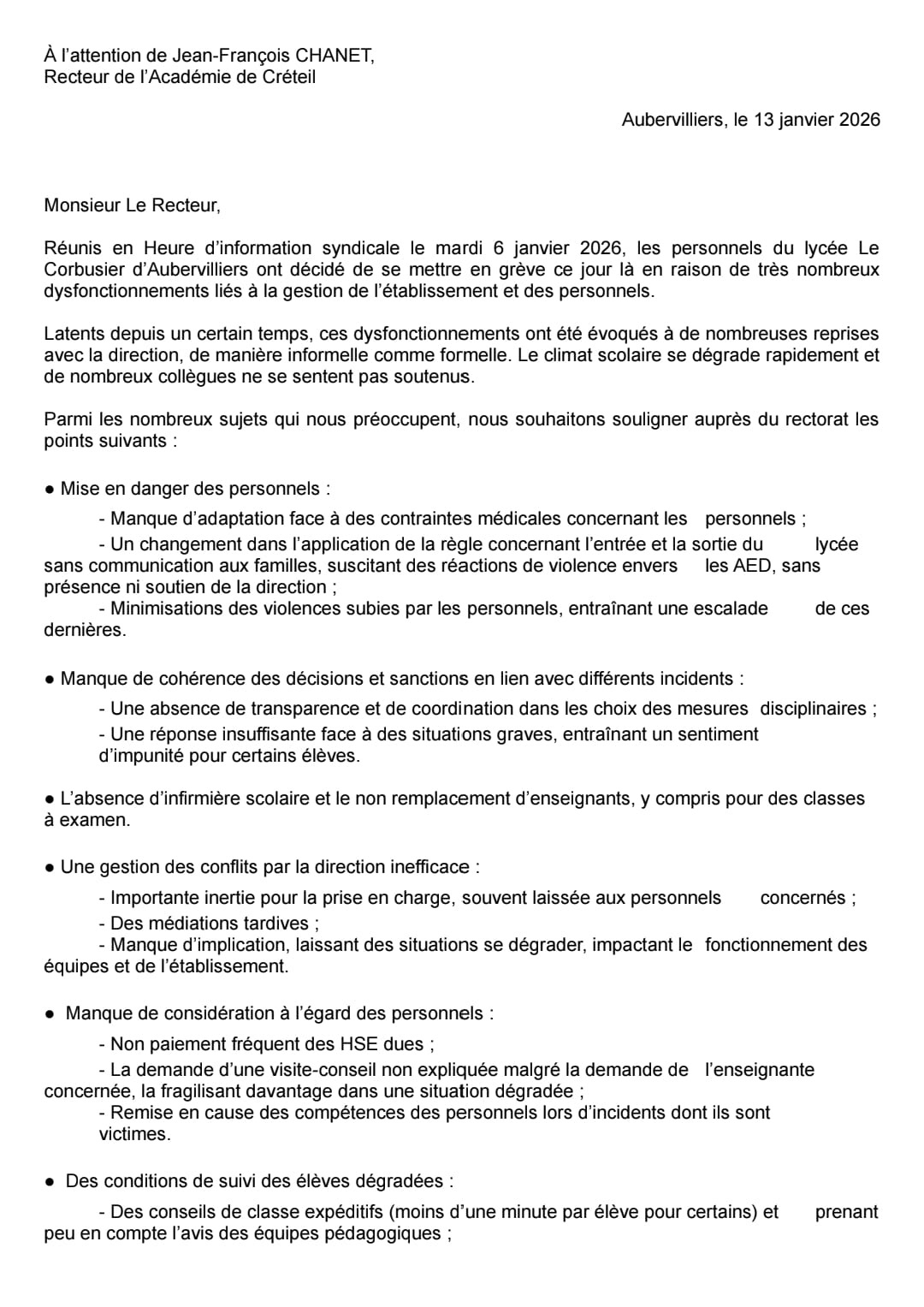 Vous êtes ici : Accueil actu des établissements Seine-Saint-Denis Le lycée Le Corbusier (Aubervilliers) en alerte 14 janvier 2026 actu des établissements Le lycée Le Corbusier (Aubervilliers) en alerte Lettre au recteur du 13 janvier 2026.