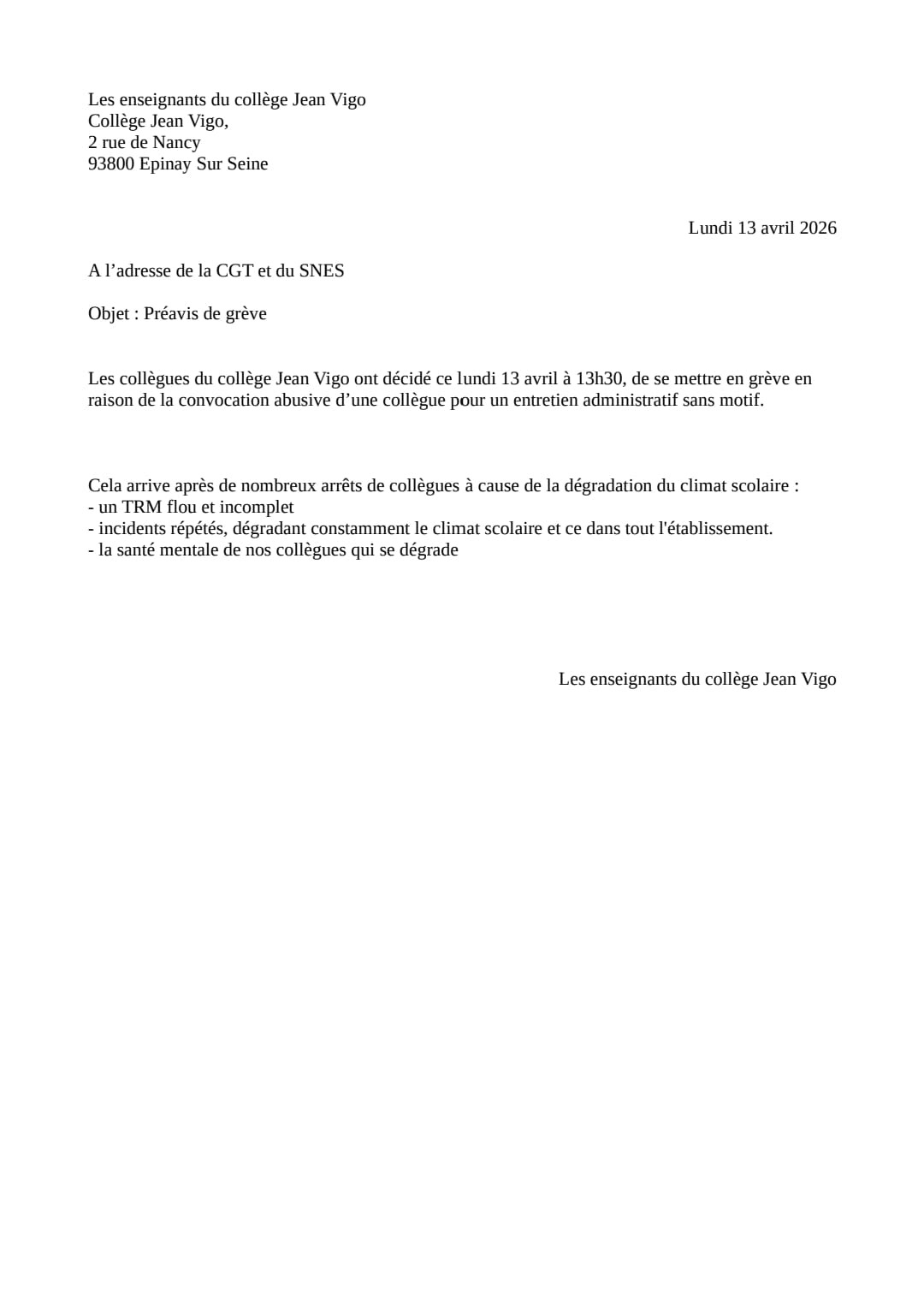Vous êtes ici : Accueil actu des établissements Seine-Saint-Denis Les personnels du collège Jean Vigo (Epinay-sur-Seine) sont en grève 13 avril 2026 actu des établissements Les personnels du collège Jean Vigo (Epinay-sur-Seine) sont en grève Courrier des personnels sur la grève du lundi 13 avril 2026.