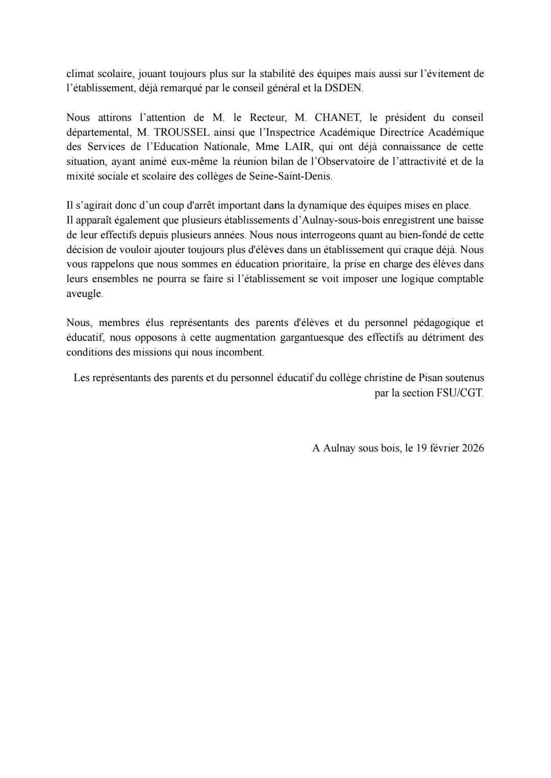 Vous êtes ici : Accueil actu des établissements Seine-Saint-Denis Motions des personnels du collège Christine de Pisan (Aulnay-sous-bois) 8 mars 2026 actu des établissements Motions des personnels du collège Christine de Pisan (Aulnay-sous-bois)
