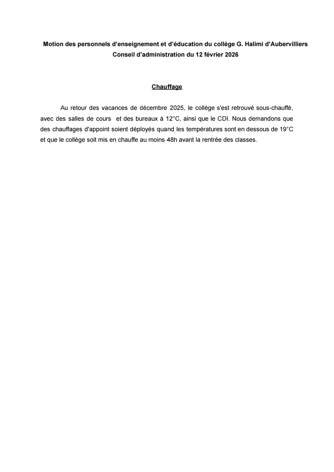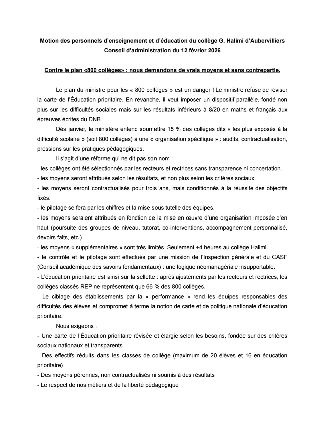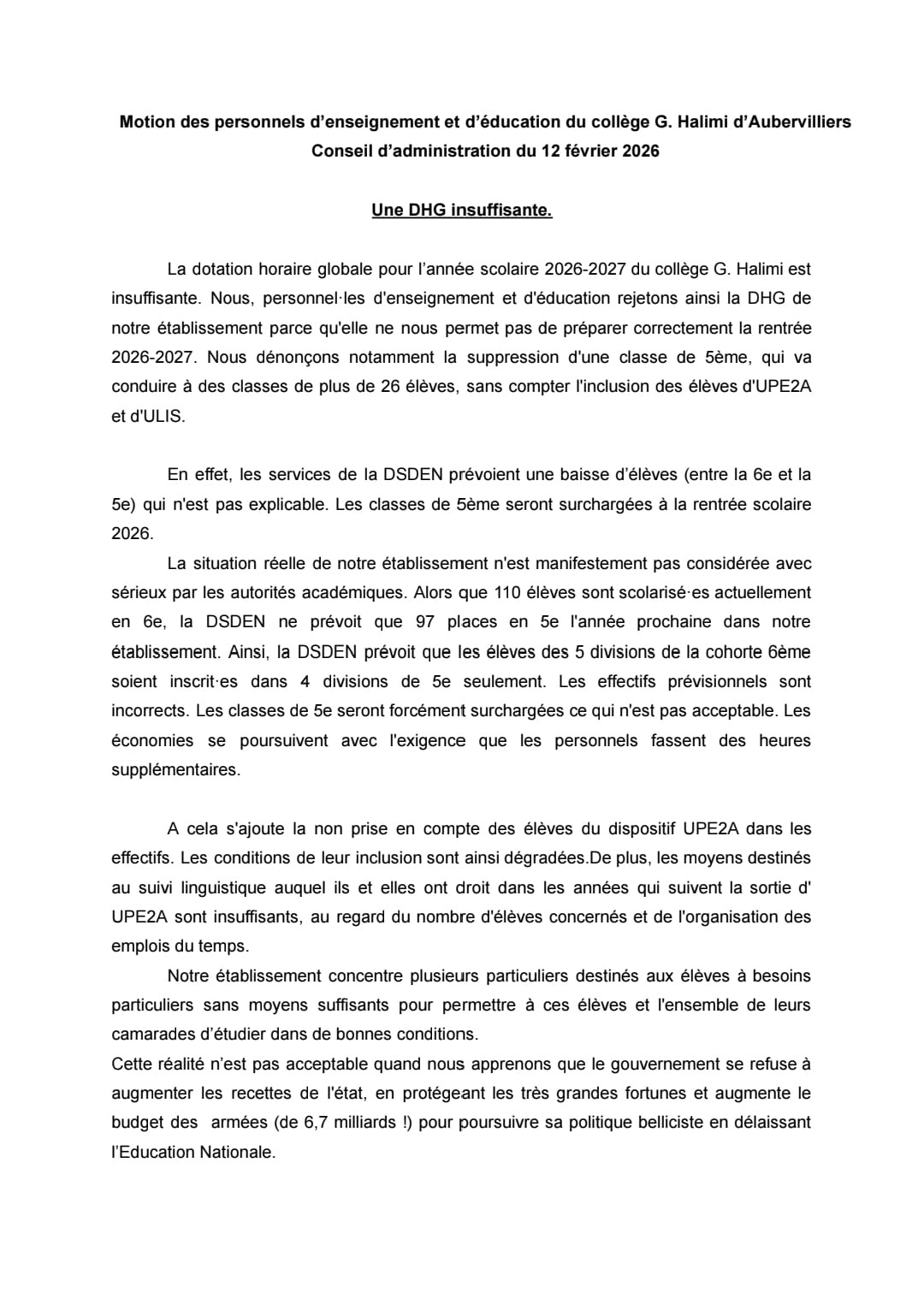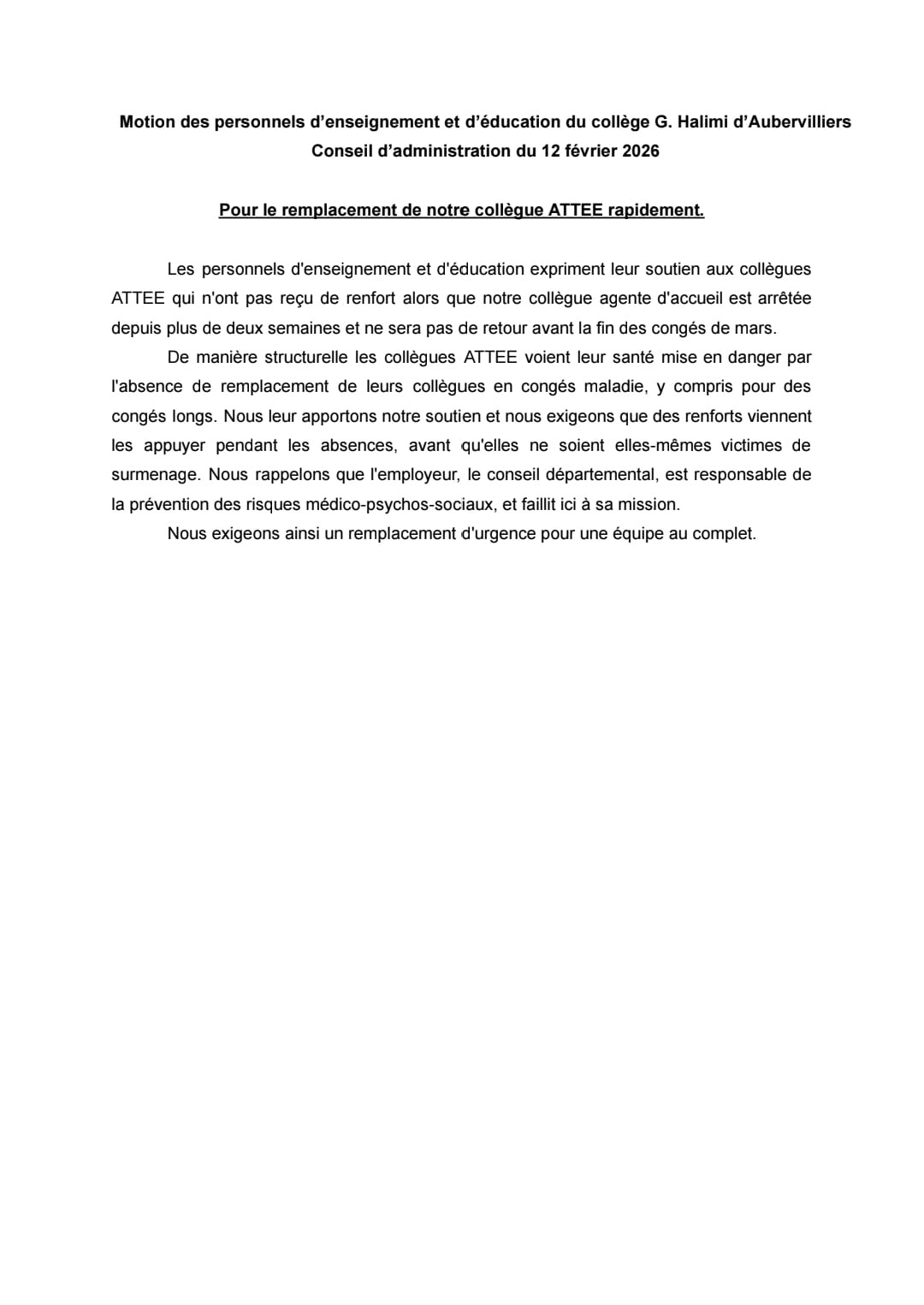 Vous êtes ici : Accueil actu des établissements Seine-Saint-Denis Motions des personnels du collège Halimi (Aubervilliers) 20 février 2026 actu des établissements Motions des personnels du collège Halimi (Aubervilliers)