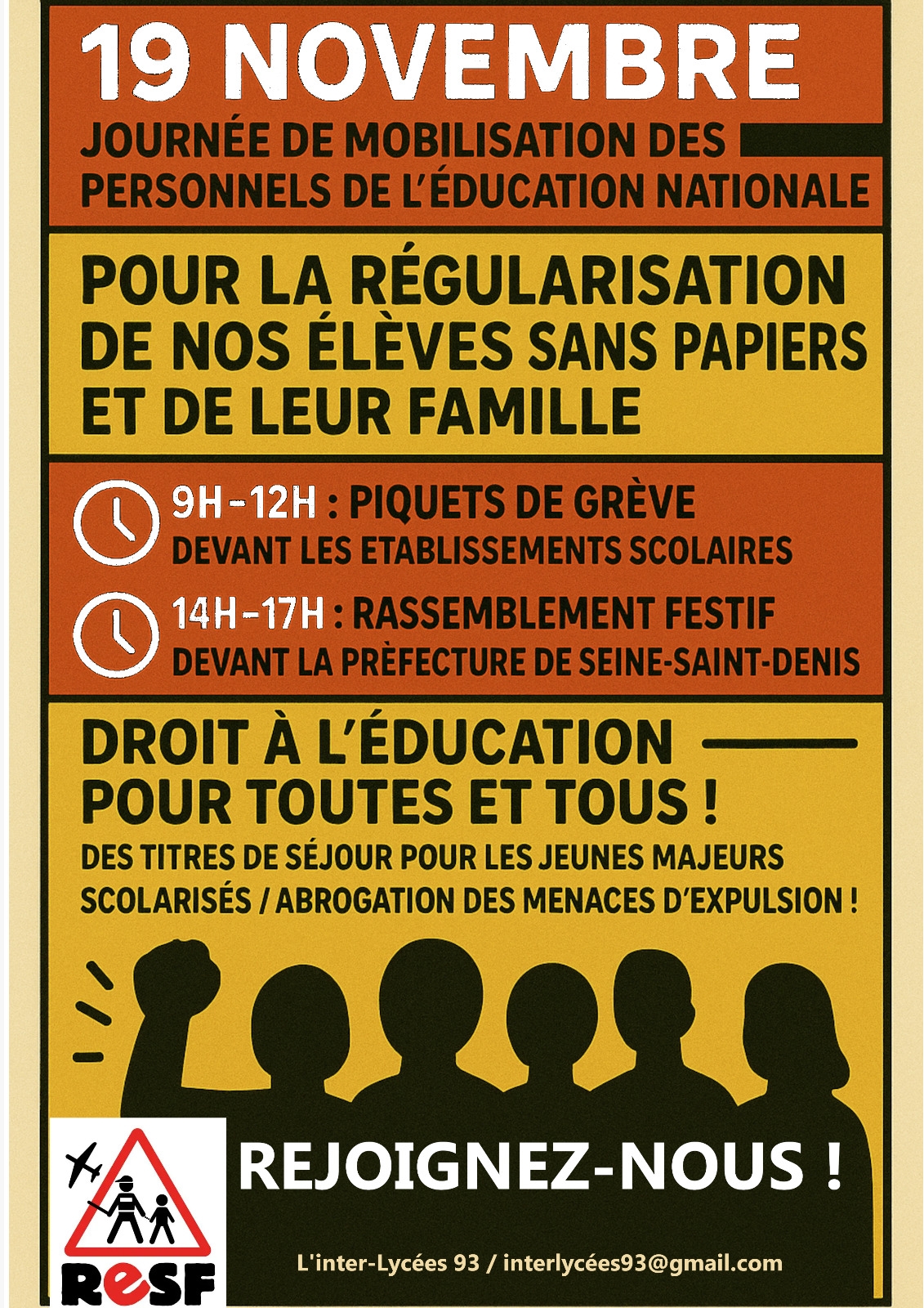 Les personnels mobilisé.es de Seine-Saint-Denis appellent à la grève le mercredi 19 novembre pour soutenir les élèves « sans papiers » et leurs familles. Un rassemblement est appelé devant la préfecture de Seine-Saint-Denis.