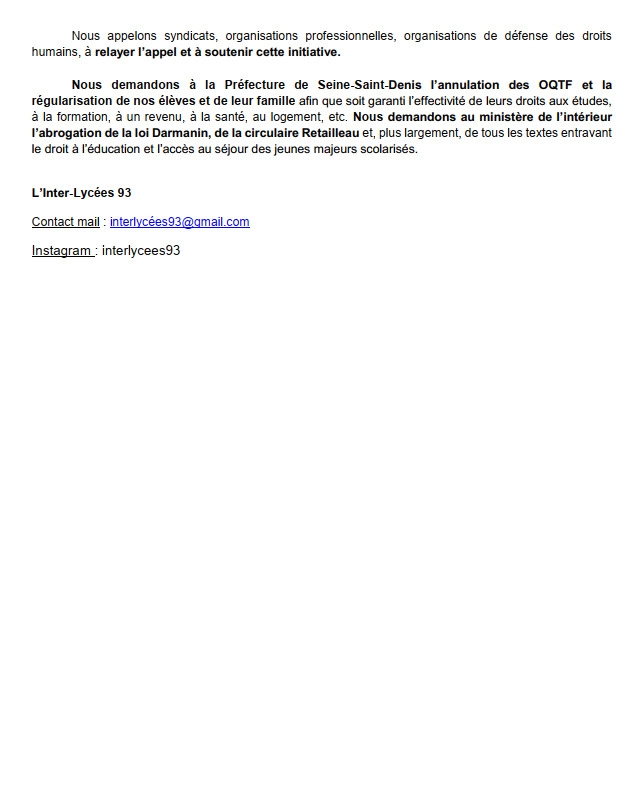 Nous demandons à la Préfecture de Seine Saint Denis l’annulation des OQTF et la régularisation de nos élèves et de leurs familles.