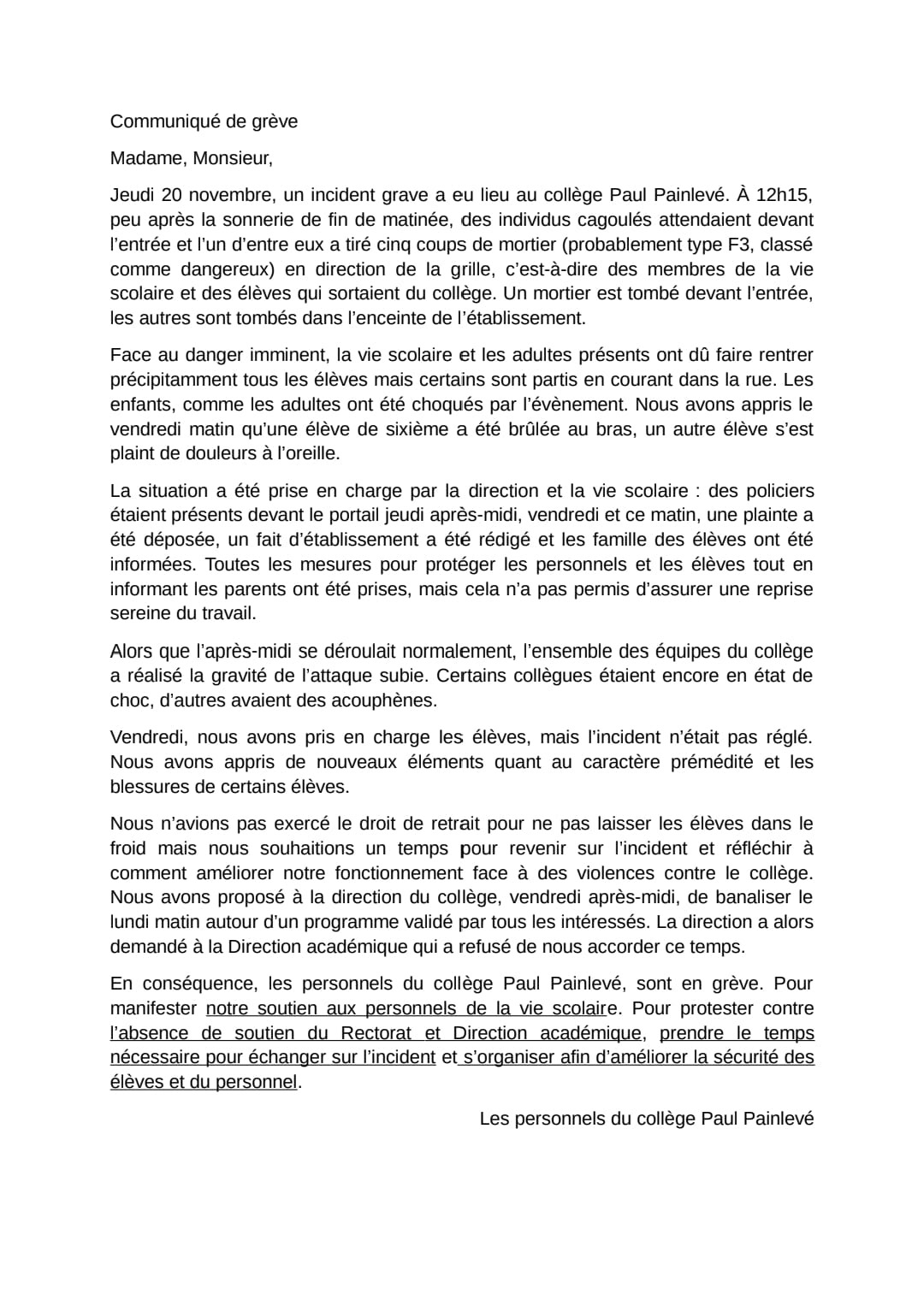 Vous êtes ici : Accueil actu des établissements Seine-Saint-Denis Communiqué de grève des personnels du collège Painlevé (Sevran) 24 novembre 2025 actu des établissements Communiqué de grève des personnels du collège Painlevé (Sevran)