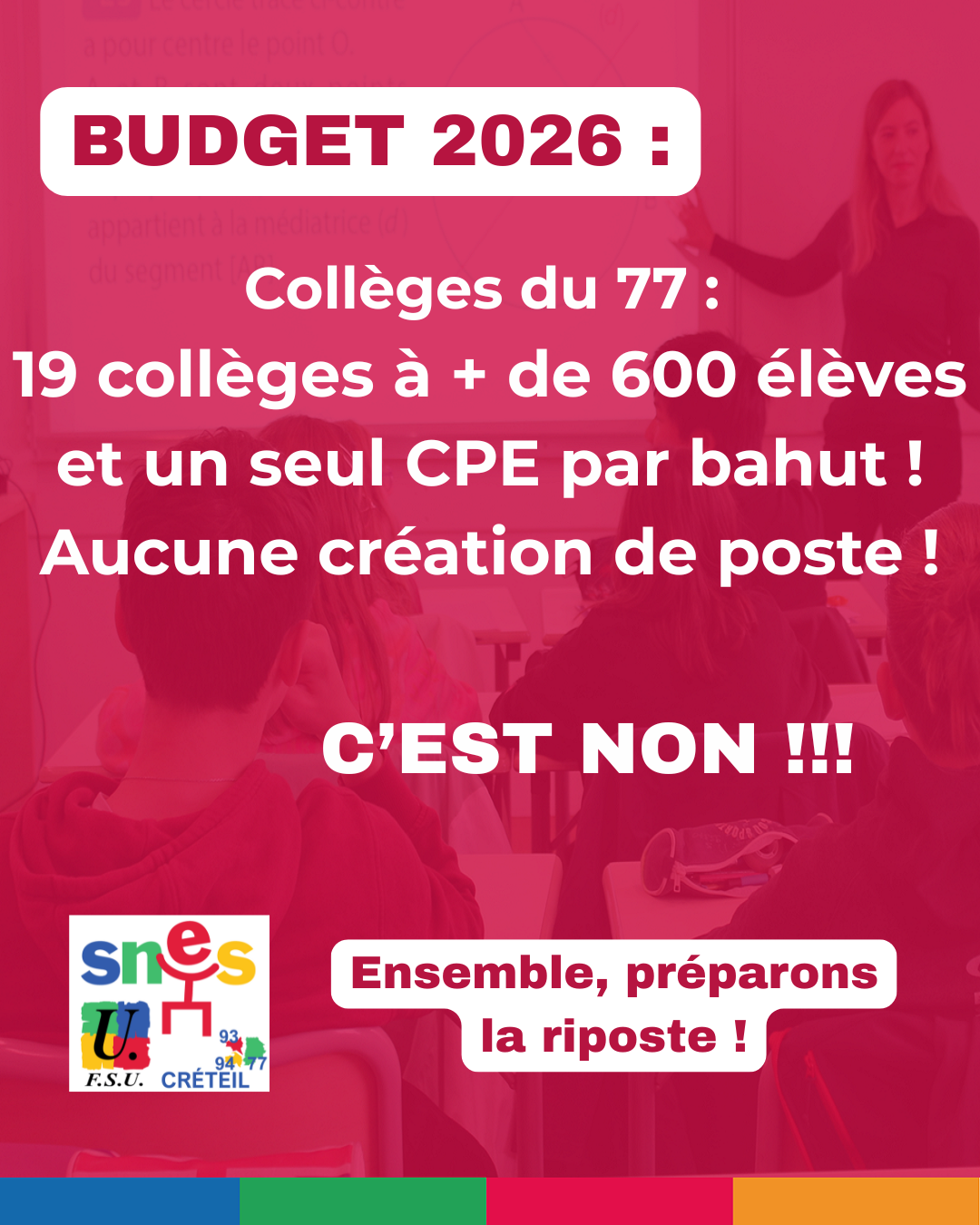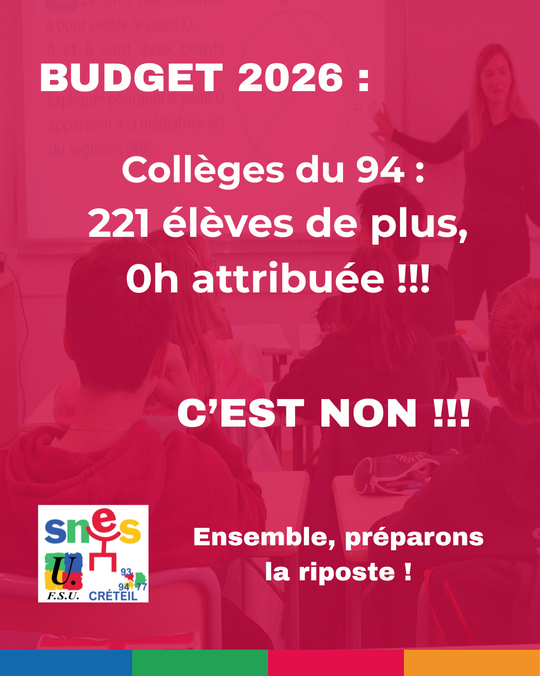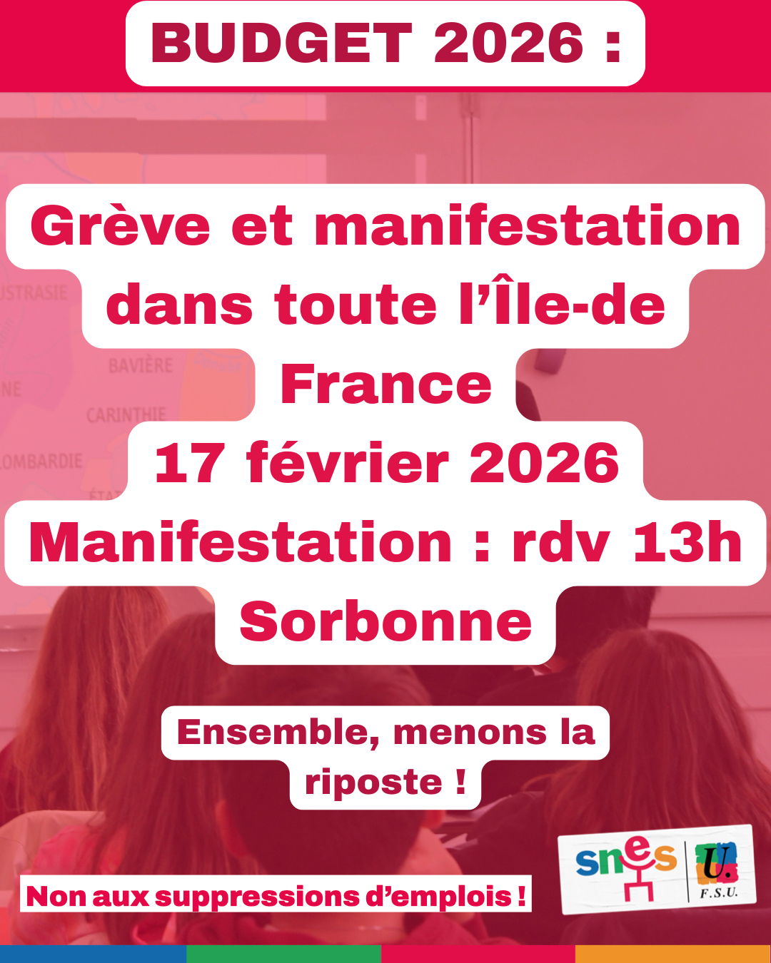 Le SNES-FSU Créteil appelle les personnels du second degré de l’académie à se mettre en grève et à manifester le 17 février 2026 contre le budget 2026 ! Les baisses de moyens dans l’Education, cela suffit !