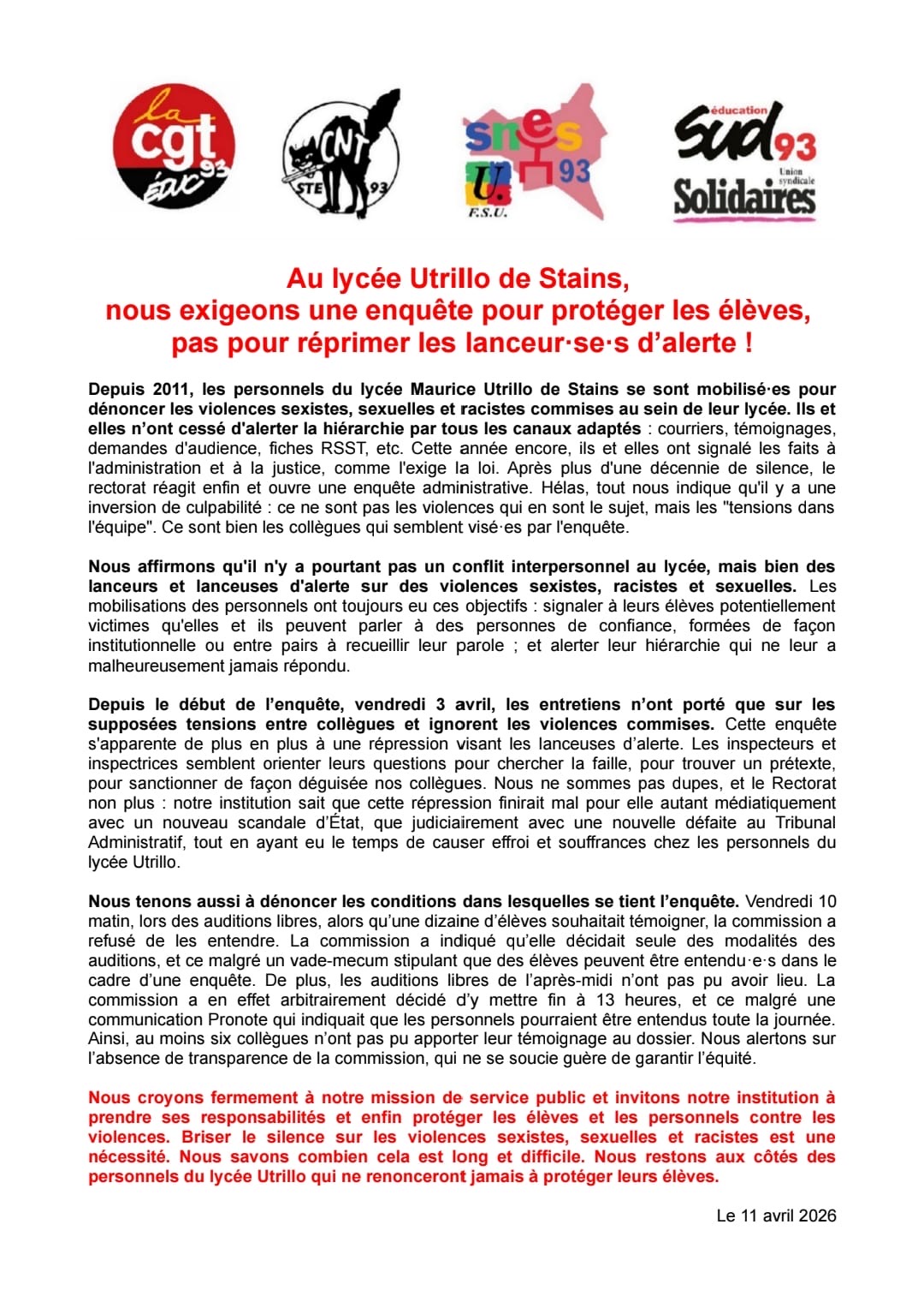Vous êtes ici : Accueil actu des établissements Seine-Saint-Denis L’administration enquête à charge contre les victimes au lycée Utrillo (Stains) 12 avril 2026 actu des établissements L’administration enquête à charge contre les victimes au lycée Utrillo (Stains)