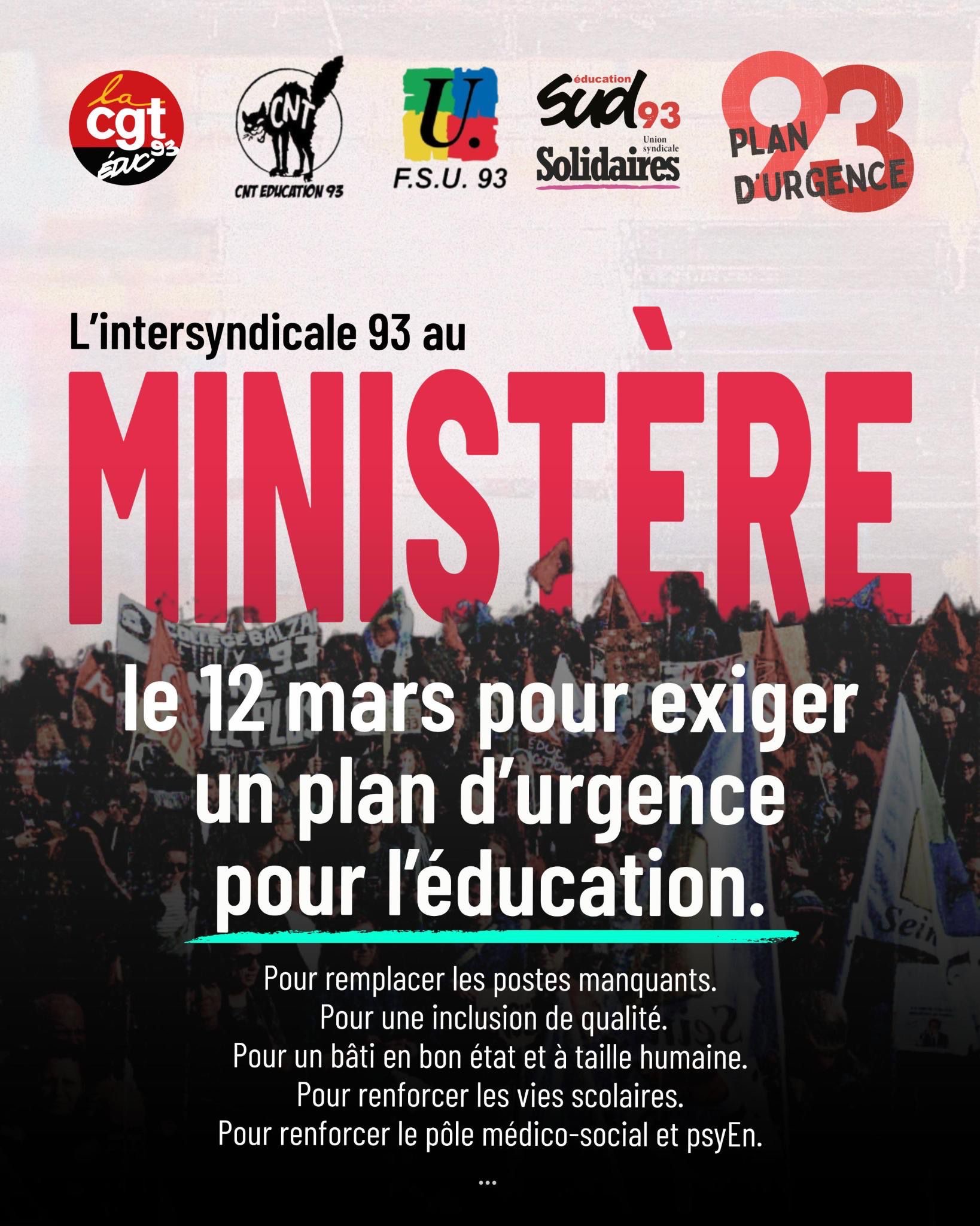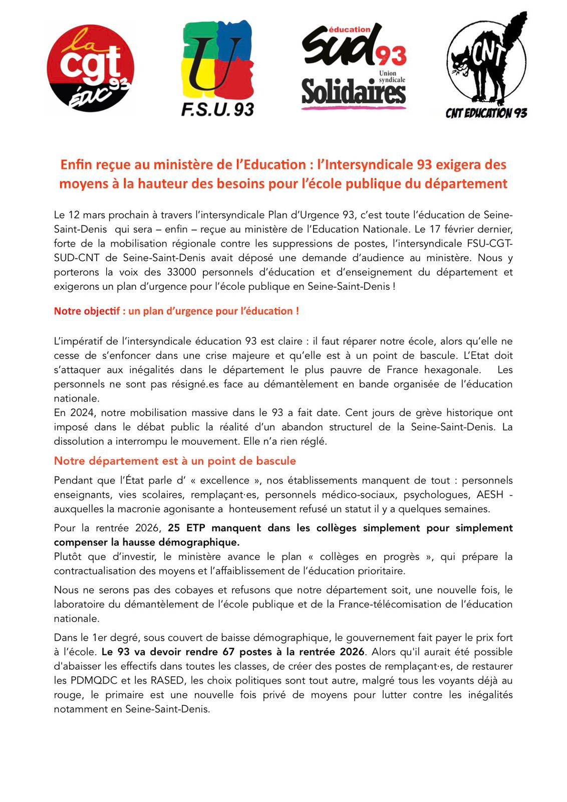 Vous êtes ici : Accueil actu des établissements Seine-Saint-Denis L’intersyndicale 93 sera au ministère le 12 mars 9 mars 2026 actu des établissements L’intersyndicale 93 sera au ministère le 12 mars