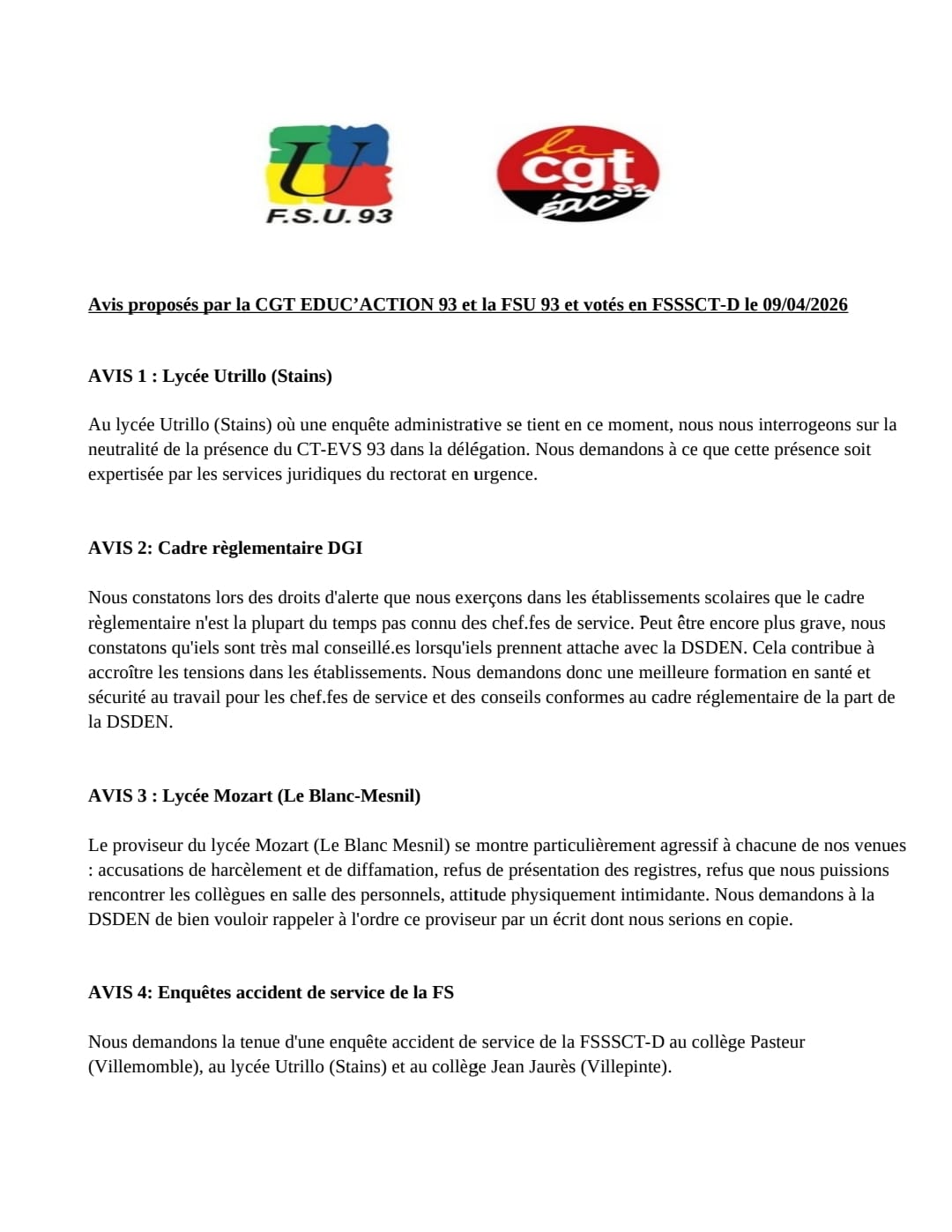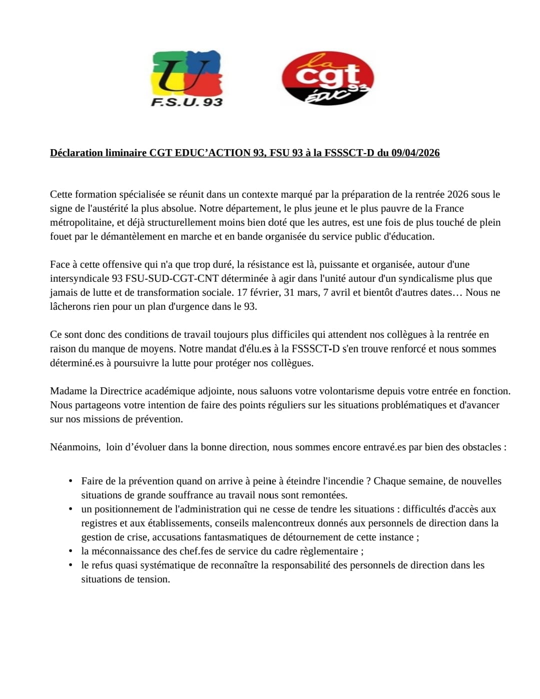Vous êtes ici : Accueil actu des établissements Seine-Saint-Denis La FSU 93 à l’offensive en FSSSCT-D 9 avril 2026 actu des établissements La FSU 93 à l’offensive en FSSSCT-D