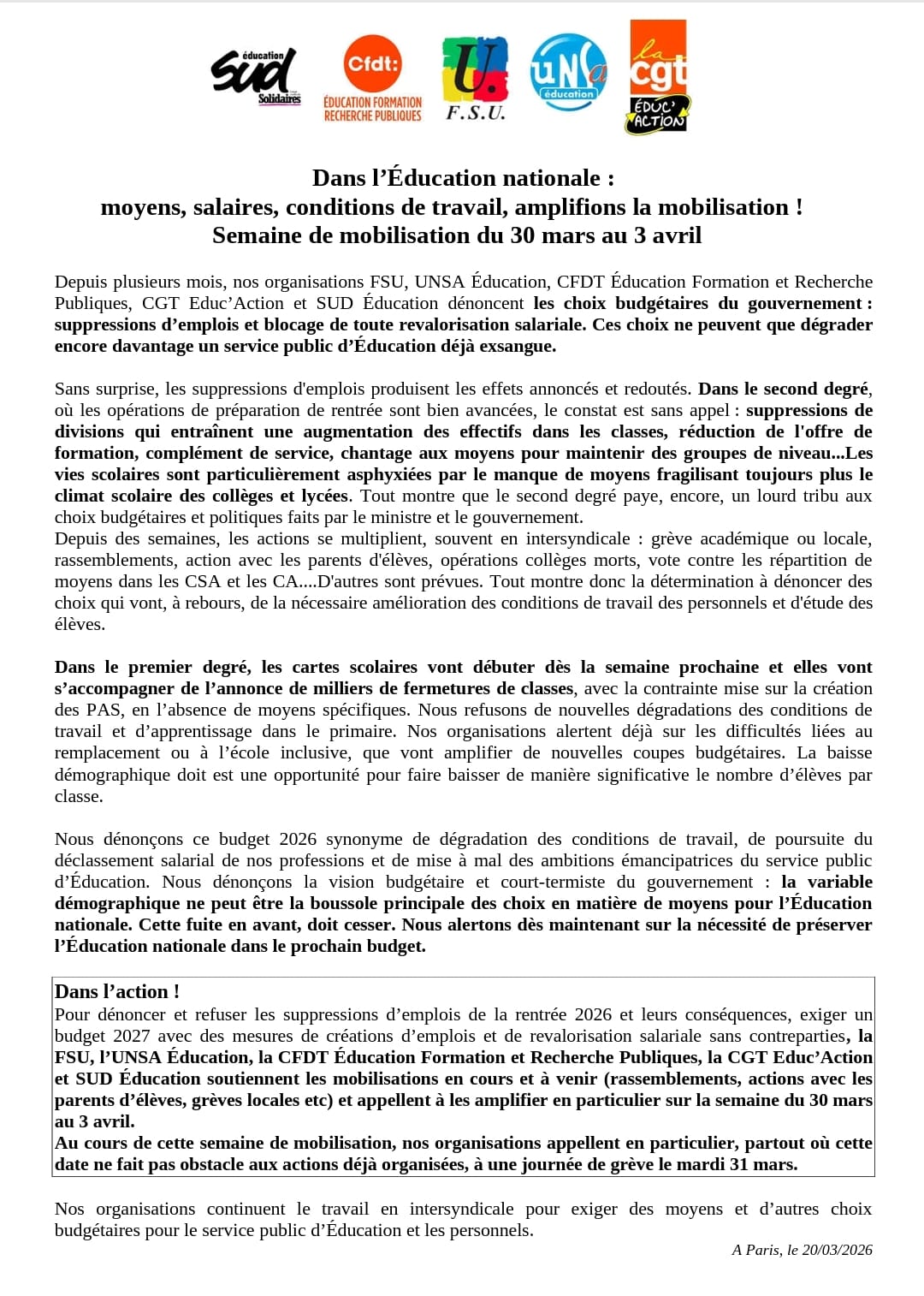 Vous êtes ici : Accueil actu des établissements Seine-Saint-Denis Le 31 mars toutes et tous en grève et en manifestation pour défendre l’école publique 23 mars 2026 actu des établissements Le 31 mars toutes et tous en grève et en manifestation pour défendre l’école publique Communiqué intersyndical d’appel à la grève et à la mobilisation la semaine du 30 mars au 3 avril.