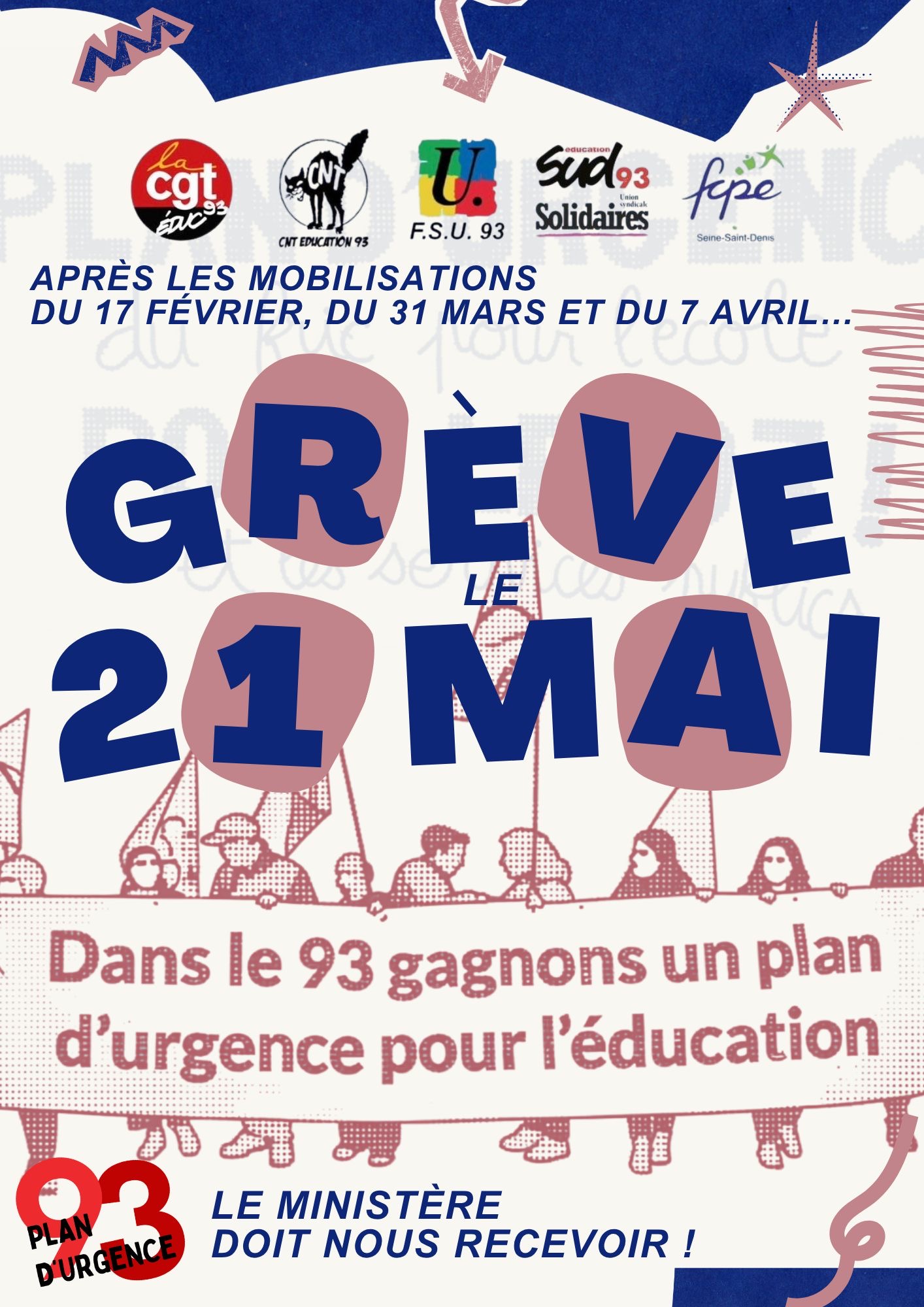 Vous êtes ici : Accueil actu des établissements Seine-Saint-Denis Le 93 ne lâche pas l’affaire : rendez-vous le 21 mai en grève et dans la rue 17 avril 2026 actu des établissements Le 93 ne lâche pas l’affaire : rendez-vous le 21 mai en grève et dans la rue