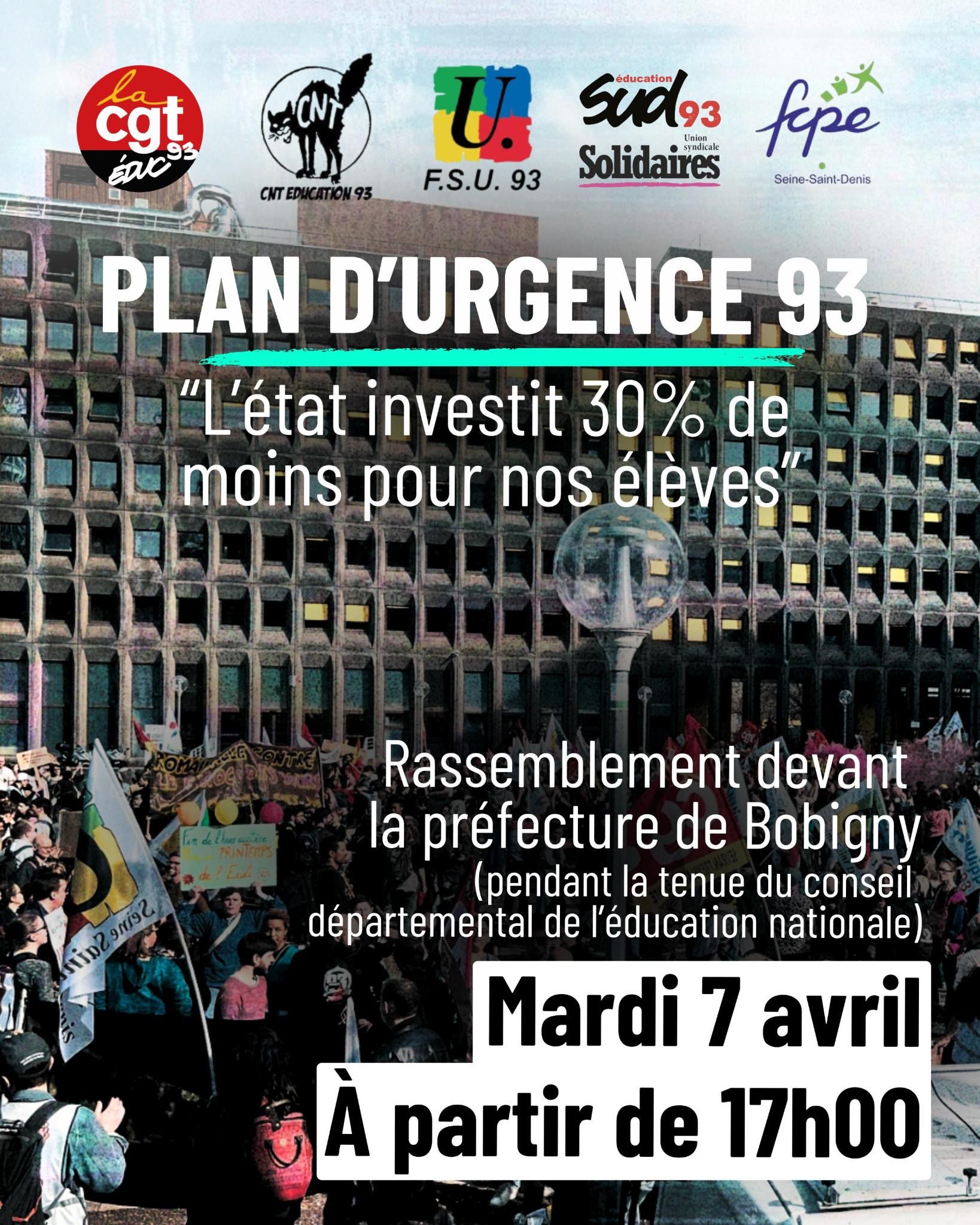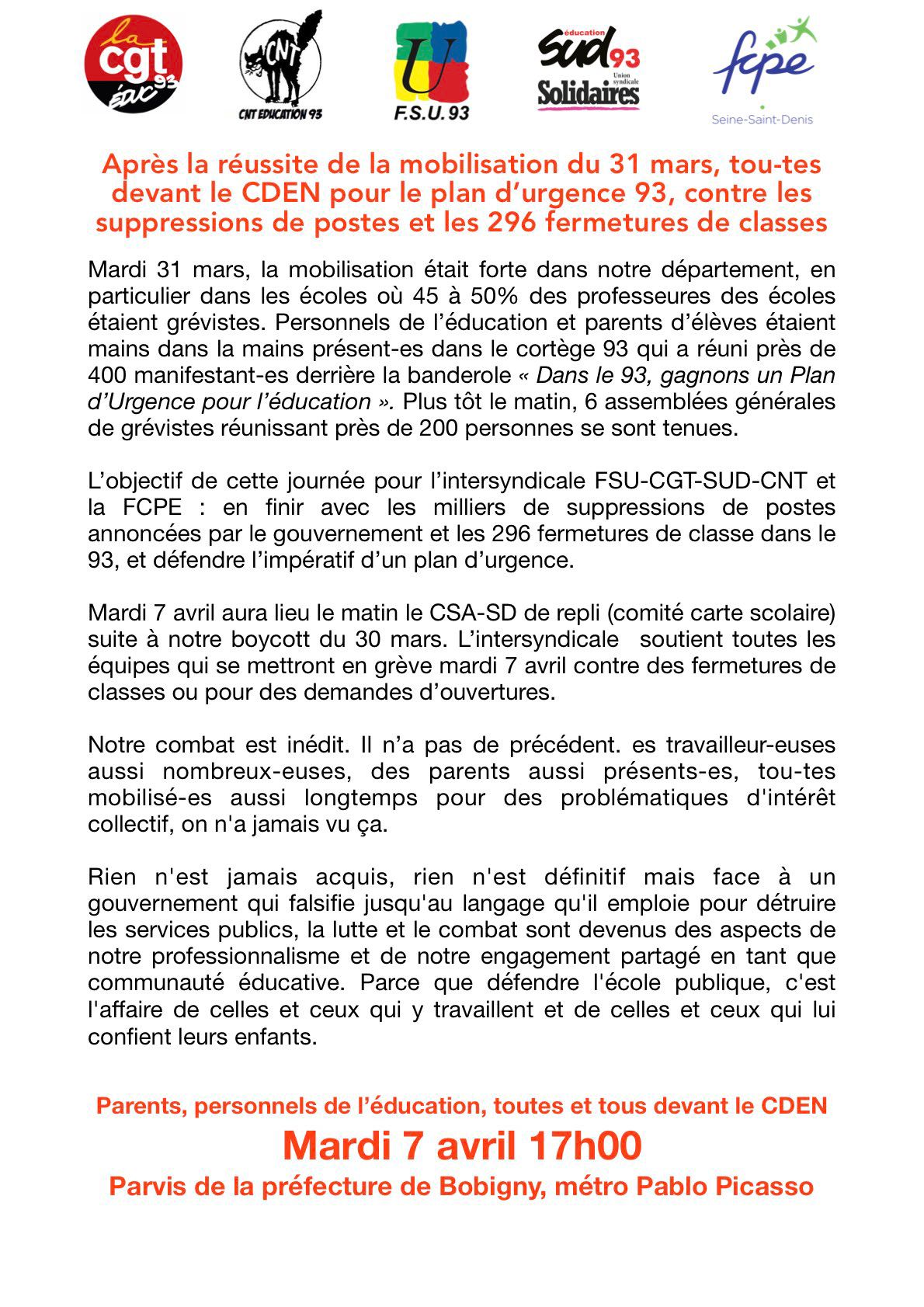Après la réussite de la mobilisation du 31 mars, le prochain appel de l’intersyndicale éducation 93 aura lieu le 7 avril prochain à 17h devant le CDEN à Bobigny