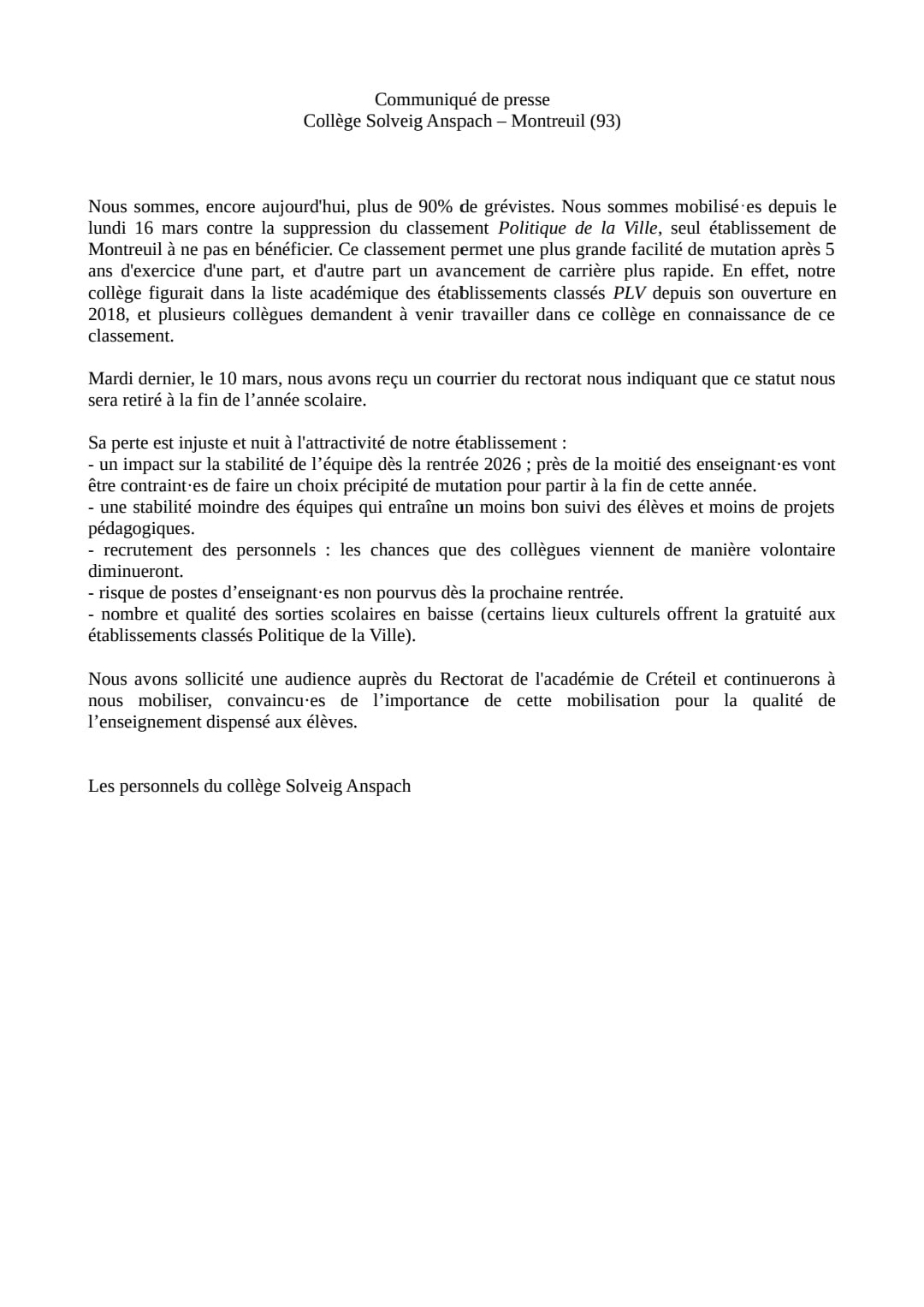 Vous êtes ici : Accueil actu des établissements Seine-Saint-Denis Le collège Anspach (Montreuil) en lutte contre la suppression du classement PLV 17 mars 2026 actu des établissements Le collège Anspach (Montreuil) en lutte contre la suppression du classement PLV