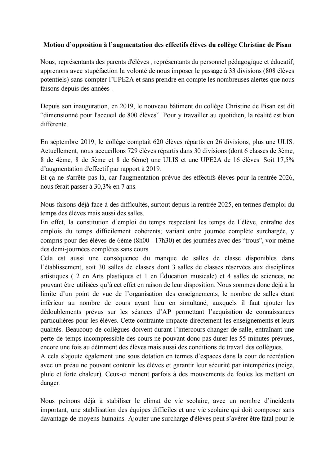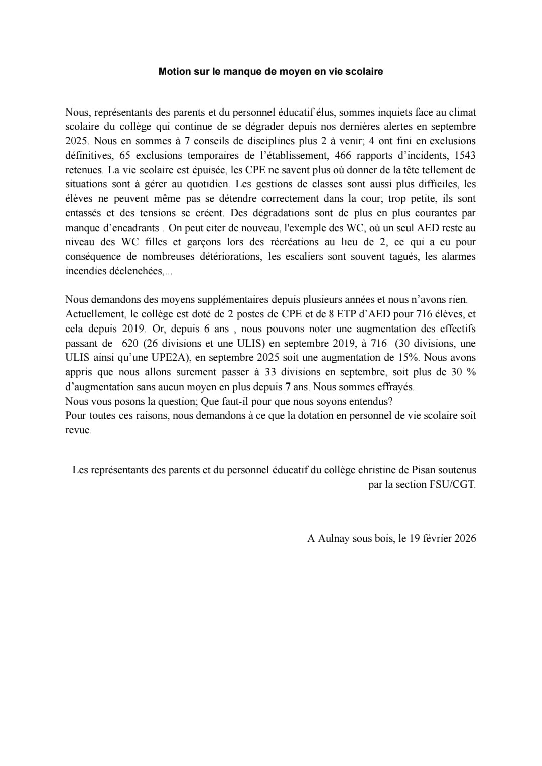 Vous êtes ici : Accueil actu des établissements Seine-Saint-Denis Motions des personnels du collège Christine de Pisan (Aulnay-sous-bois) 8 mars 2026 actu des établissements Motions des personnels du collège Christine de Pisan (Aulnay-sous-bois)