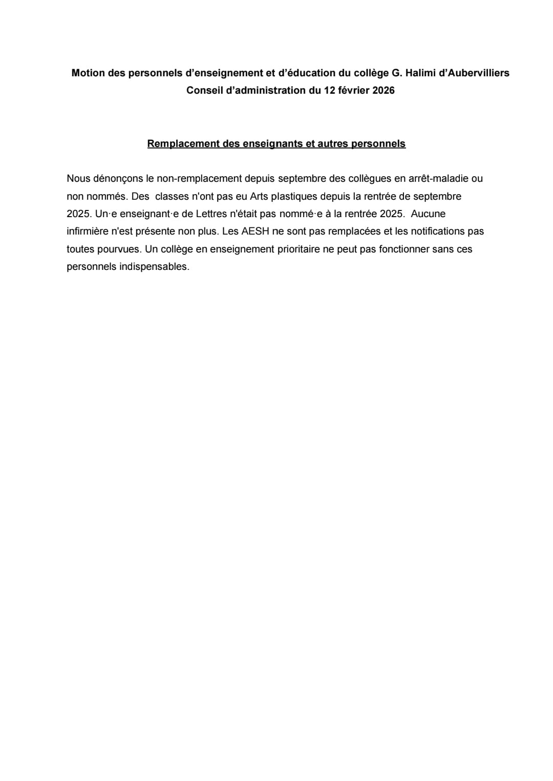 Vous êtes ici : Accueil actu des établissements Seine-Saint-Denis Motions des personnels du collège Halimi (Aubervilliers) 20 février 2026 actu des établissements Motions des personnels du collège Halimi (Aubervilliers)