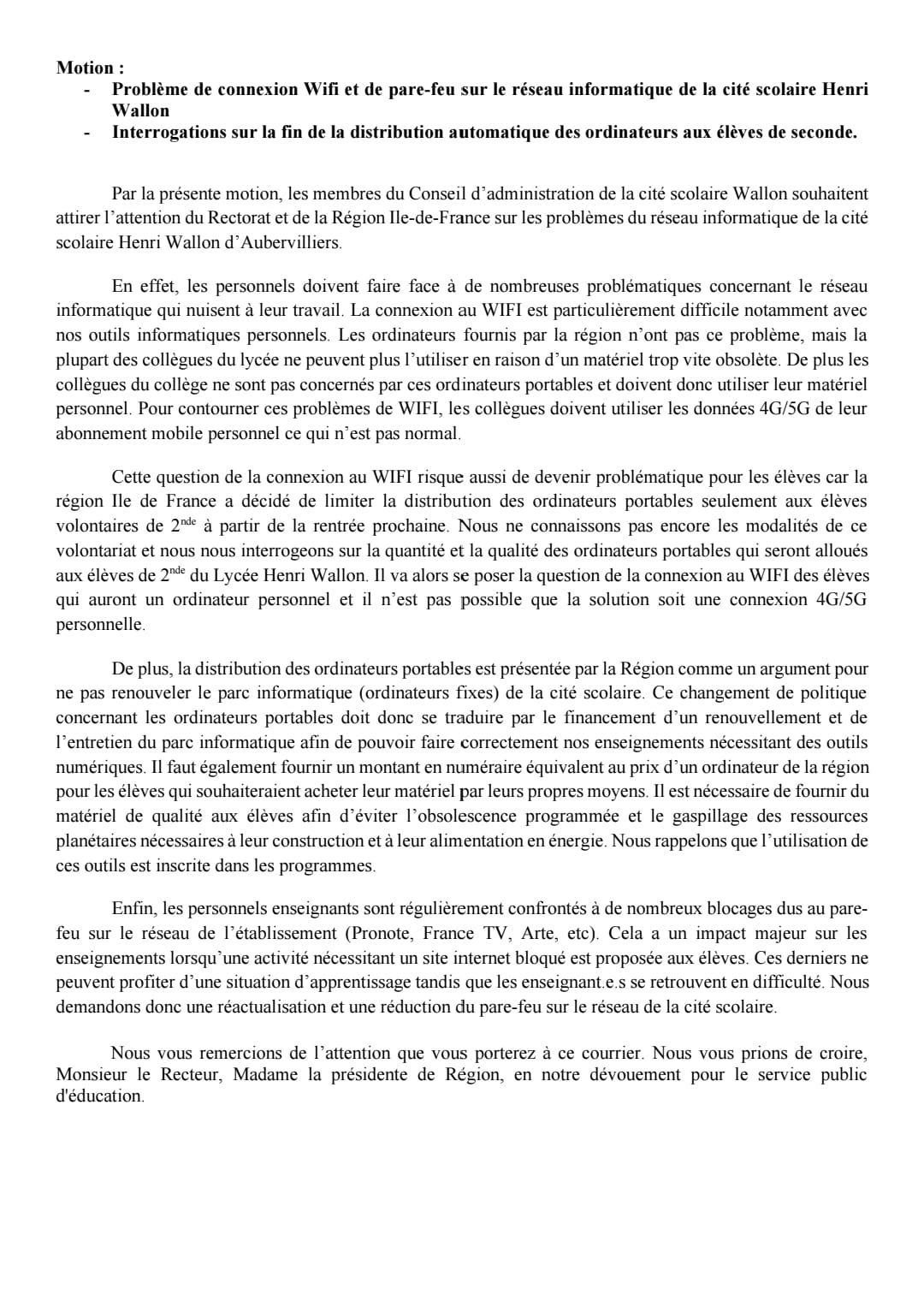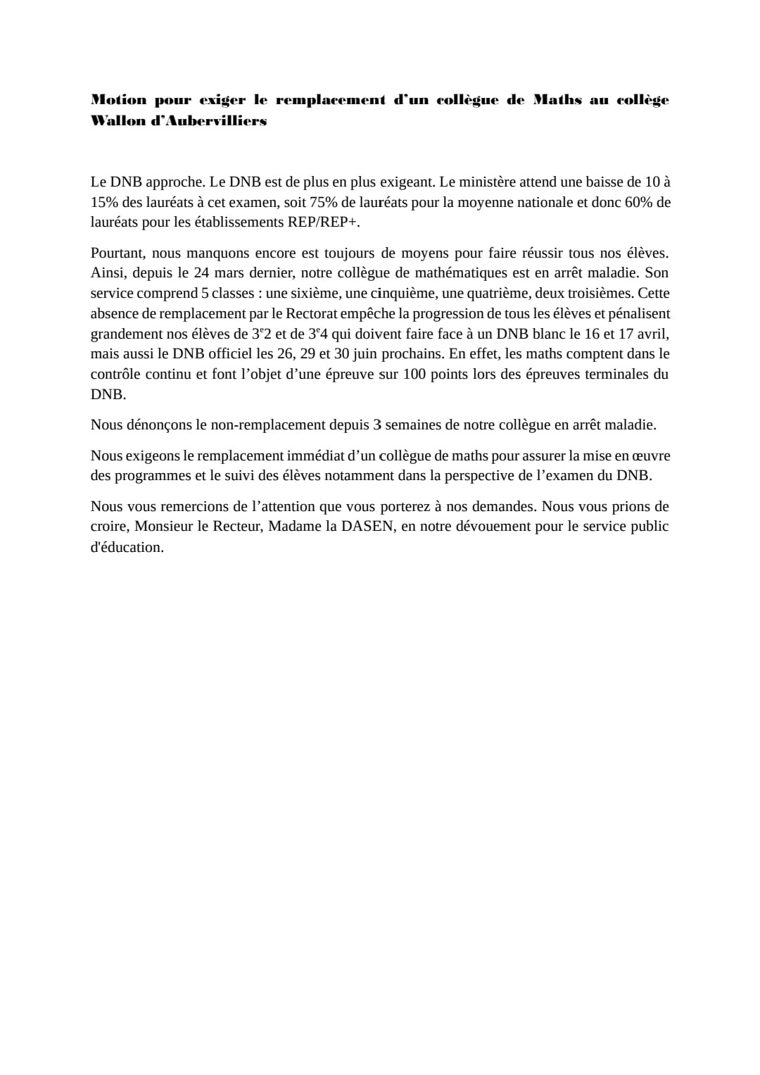 Vous êtes ici : Accueil actu des établissements Seine-Saint-Denis Motions votées en CA au collège Wallon (Aubervilliers) 18 avril 2026 actu des établissements Motions votées en CA au collège Wallon (Aubervilliers)