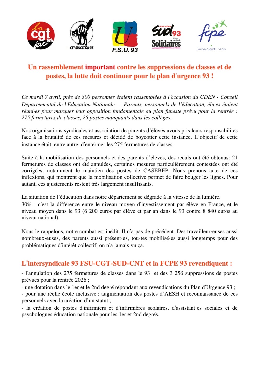 Vous êtes ici : Accueil actu des établissements Seine-Saint-Denis On ne lâche rien pour un plan d’urgence dans le 93 10 avril 2026 actu des établissements On ne lâche rien pour un plan d’urgence dans le 93
