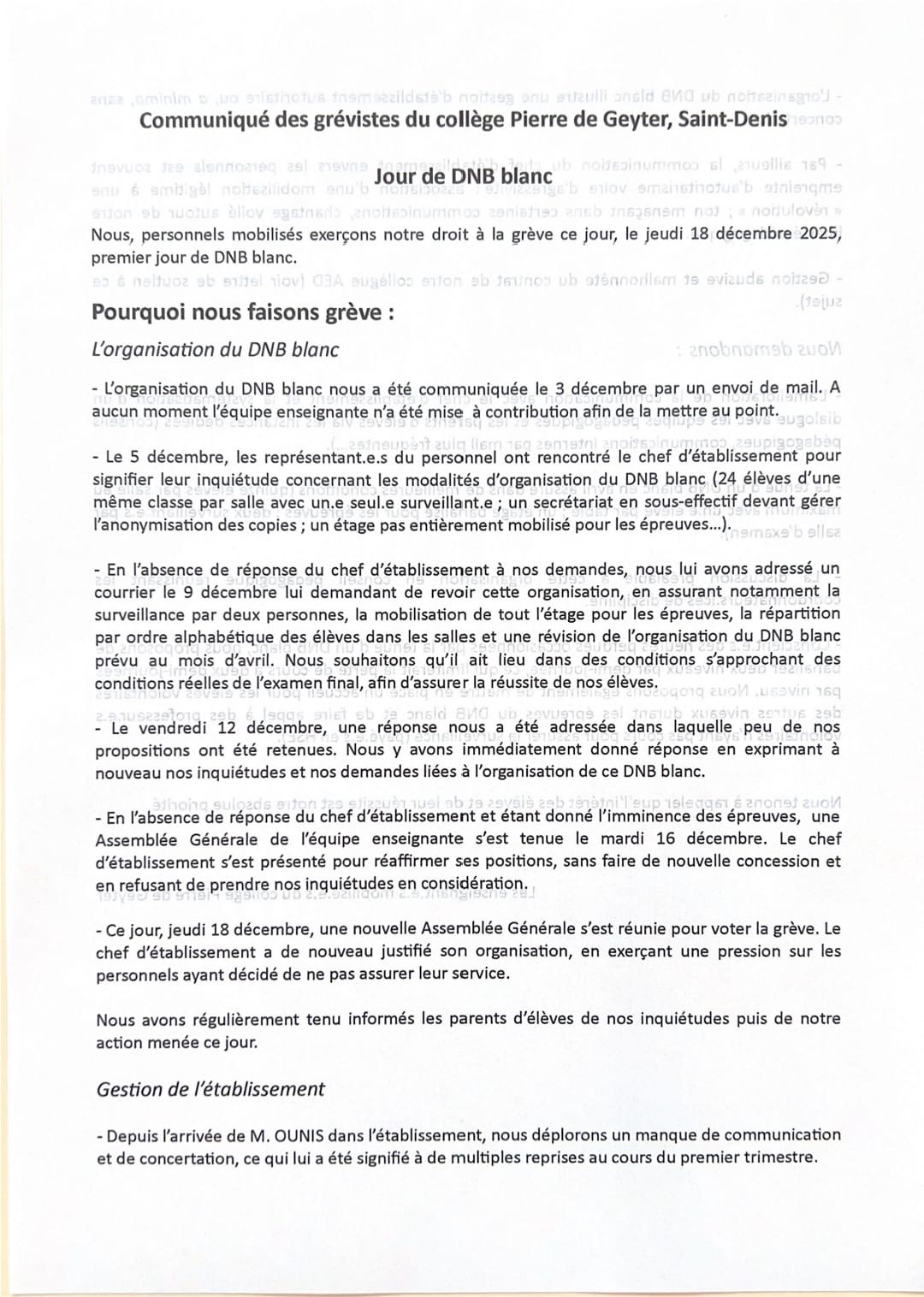 Vous êtes ici : Accueil actu des établissements Seine-Saint-Denis Organisation erratique au collège Pierre de Geyter (Saint-Denis) 21 décembre 2025 actu des établissements Organisation erratique au collège Pierre de Geyter (Saint-Denis)